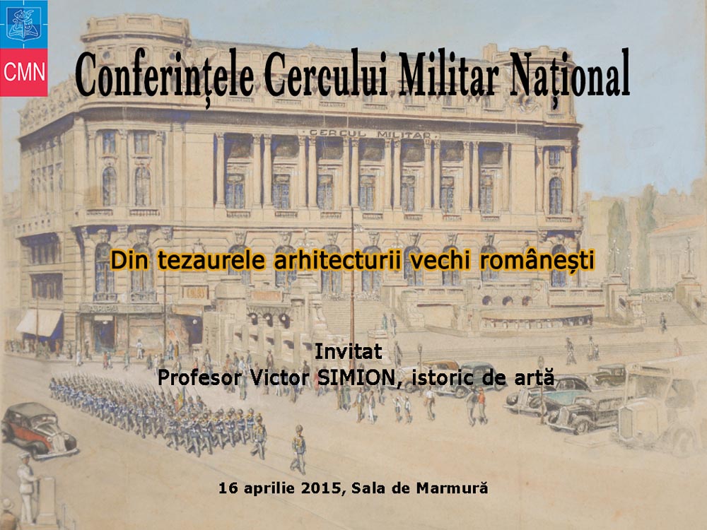 Joi, 16 aprilie 2015, ora 18.00, la Sala de Marmură, va avea loc Conferința cu tema: „DIN TEZAURELE ARHITECTURII VECHI ROMÂNEȘTI”, susținută de profesor Victor SIMION, istoric de artă. Evenimentul este ocazionat de sărbătorirea Zilei Mondiale a monumentelor şi a siturilor şi face parte din ciclul „Conferinţele Cercului Militar Naţional”, iniţiat în anul 2011.