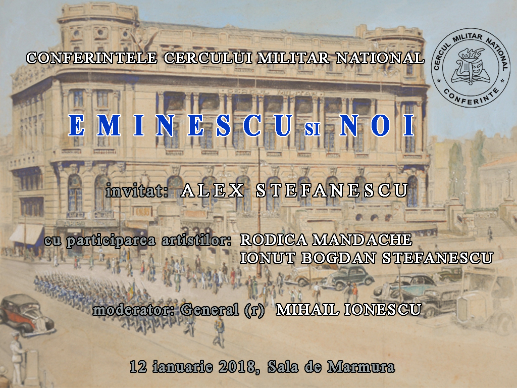 Vineri, 12 ianuarie 2018, Cercul Militar Național a marchat Ziua Culturii Naționale și cei 168 ani de la nașterea poetului Mihai Eminescu printr-o serie de manifestări culturale. Sala de Marmură a găzduit Conferința ”EMINESCU ȘI NOI” susținută de criticul literar Alex ȘTEFĂNESCU, în cadrul Conferințelor Cercului Militar Național. Evenimentul s-a constituit într-o invitație la lectură și s-a desfășurat în ritmurile flautului muzicianului Ionuț Bogdan ȘTEFĂNSCU și pe versurile poetului nepereche, rostite actrița Rodica MANDACHE. https://www.facebook.com/ObservatorMilitar/videos/1985987248110629/ https://www.facebook.com/ObservatorMilitar/videos/1979294682113219/