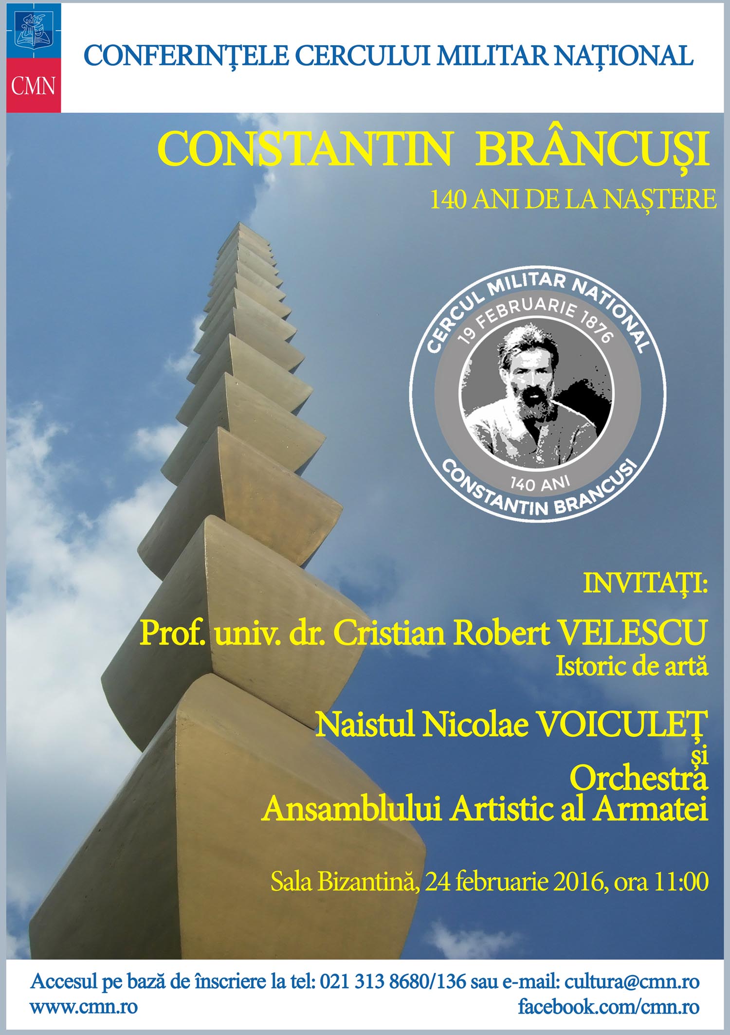 Miercuri, 24 februarie 2016, ora 11:00, la Sala Bizantină Conferințele Cercului Militar Național: Constantin Brâncuși – 140 de ani de la naștere Invitat: prof.univ. dr. Cristian Robert Velescu, istoric de artă Moment artistic susținut de naistul Nicolae Voiculeț și Orchestra Ansamblului Artistic al Armatei Accesul pe bază de înscriere la tel. 021 3138680 int.136/156 sau e-mail: cultura@cmn.ro.