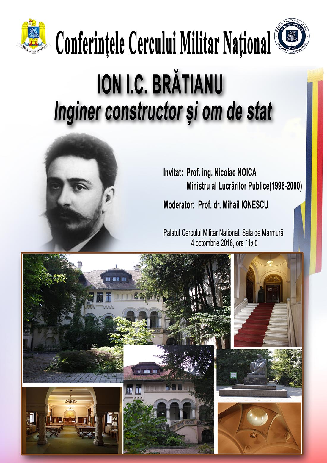 Conferințele Cercului Militar Național Marți, 4 octombrie 2016, ora 11.00, la Sala de Marmură, a avut loc Conferința cu tema „ION I.C.BRĂTIANU – Inginer constructor și om de stat”, susținută de prof.ing. Nicolae NOICA, ministru al Lucrărilor Publice (1996 – 2000). Moderator: prof.dr. Mihail IONESCU .