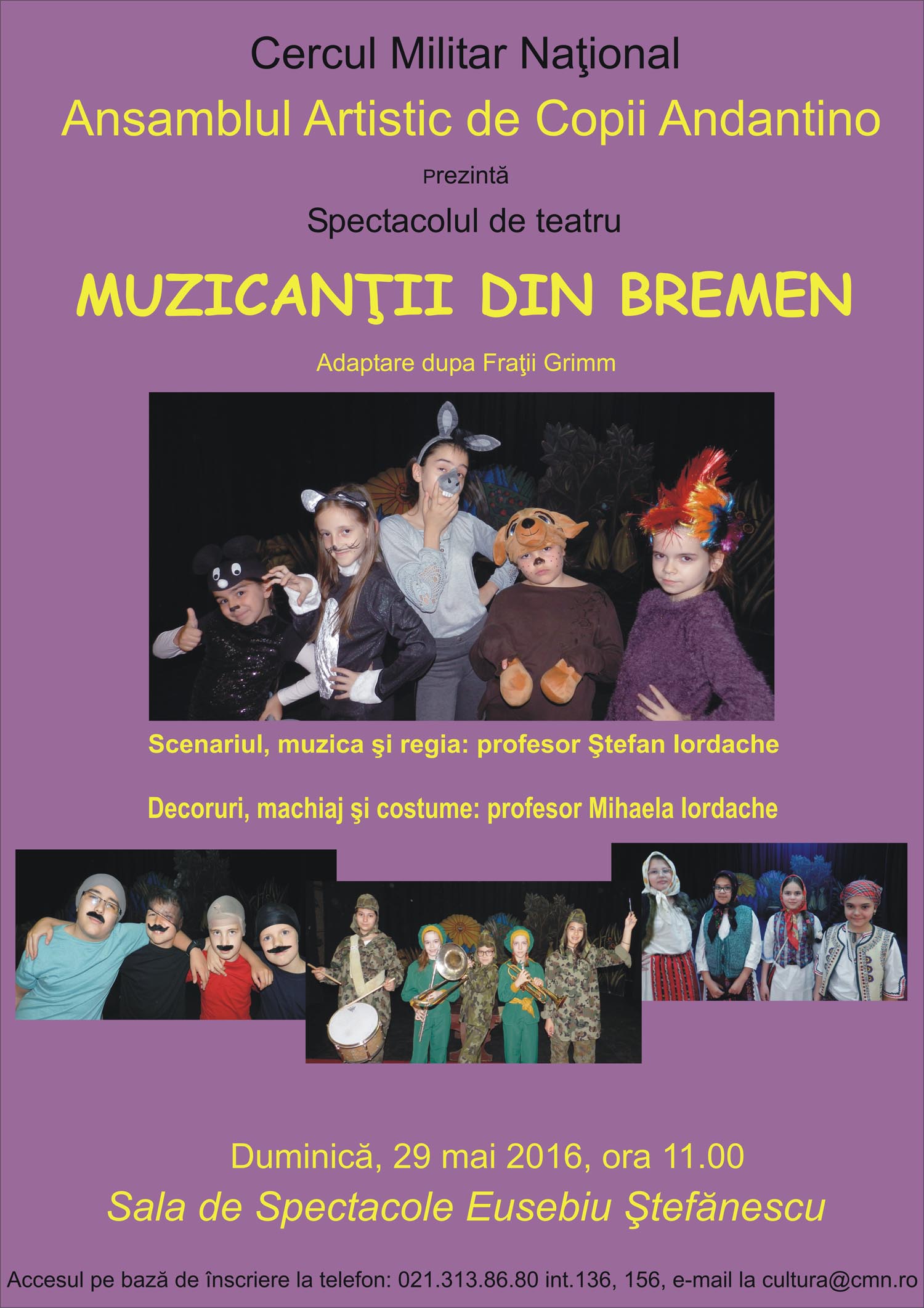 SPECTACOL de 1 IUNIE Duminică, 29 mai 2016, ora 11.00, la Sala de Spectacole „Eusebiu Ștefănescu” va avea loc spectacolul de teatru pentru copii „Muzicanții din Bremen”, susținut de Ansamblul artistic de copii ANDANTINO. Adaptare după Frații Grimm. Scenariul, muzica și regia: profesor Ștefan Iordache. Regia de culise, decoruri, machiaj și costume: profesor Mihaela Iordache.