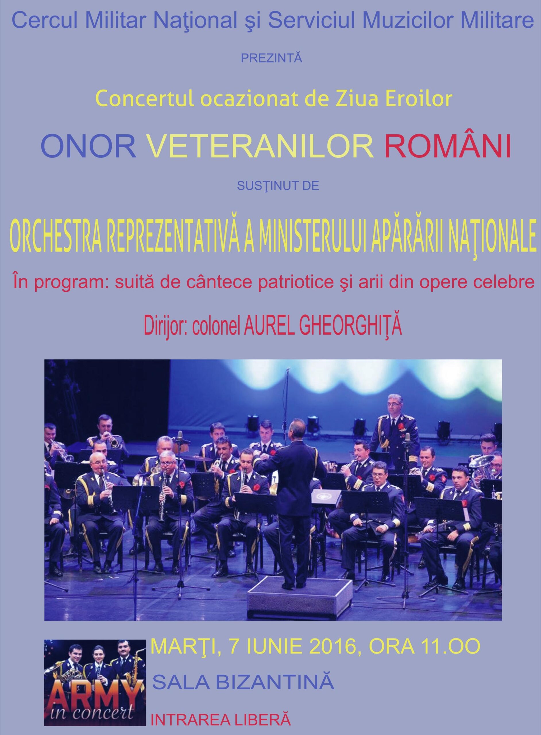 Marți, 7 iunie 2016, ora 11.00, la Sala Bizantină, va avea loc Concertul „Onor veteranilor Români” susținut de Muzica Reprezentativă a Ministerului Apărării Naționale. În program: cântece patriotice și arii din opere celebre. Dirijor: colonel Aurel Gheorghiță. Intrarea liberă.