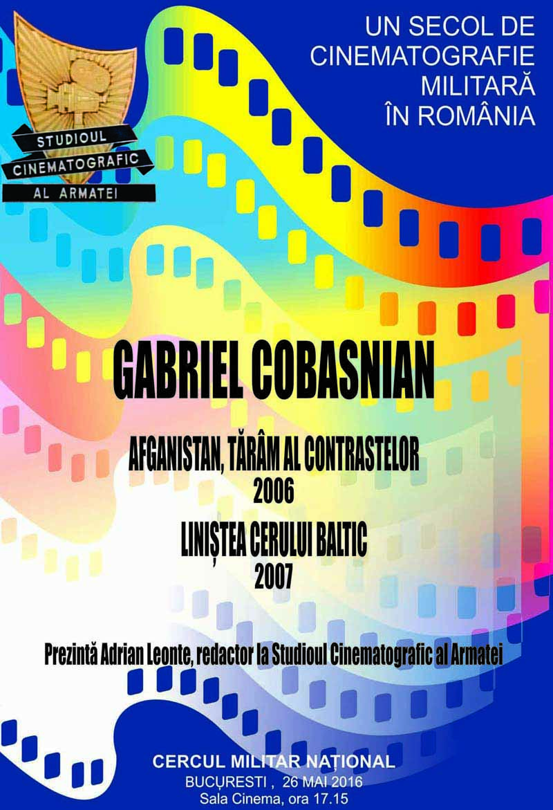 Joi, 26 mai 2016 ora 17.15, la Sala de Cinema se vor proiecta două filme realizate de regizorul Gabriel Cobasnian, cel mai cunoscut autor al cinematografiei militare din perioada recentă, Afganistan, tărâm al contrastelor (2006) și Liniștea cerului baltic (2007). Destinate în egală măsură armatei și publicului larg, cele două scurtmetraje vorbesc despre modul exemplar în care își execută militarii români misiunile de restabilire și menținere a păcii în lume. Prezintă Adrian leonte, redactor la Studioul Cinematografic al Armatei. Intrarea este liberă.