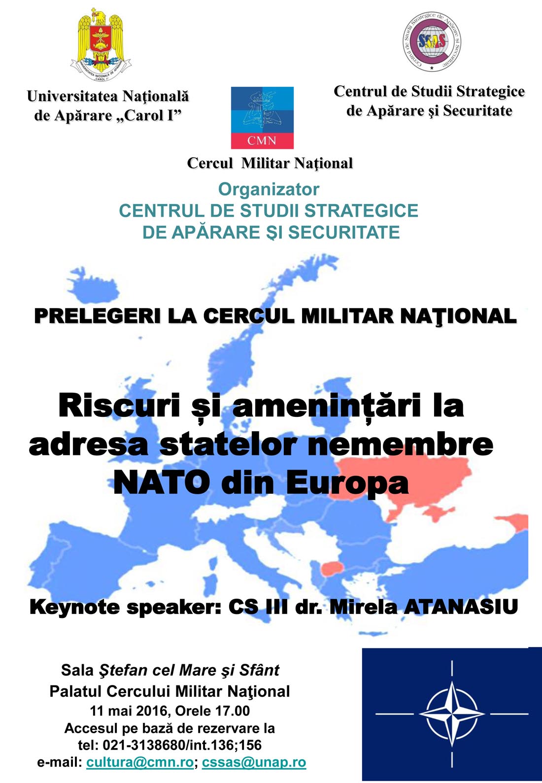 În data de 11.05.2016, începând cu orele 17.00, va avea loc cea de-a șaptea prelegere din anul universitar 2015 – 2016, cu tema: „Riscuri și amenințări la adresa statelor nemembre NATO din Europa”, susţinută de CS III dr. Mirela ATANASIU.
