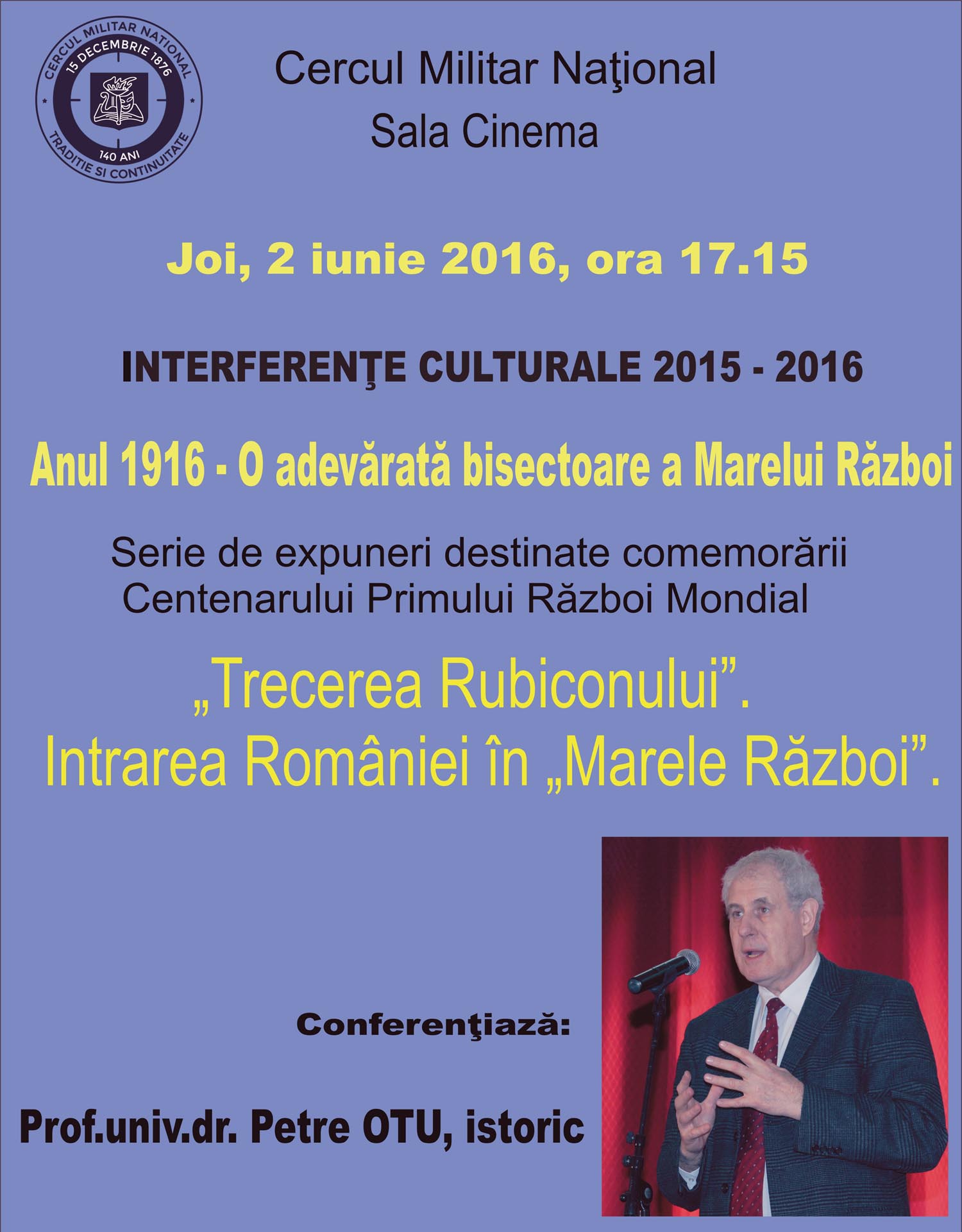 Interferențe culturale: Anul 1916 – O adevărată bisectoare a „Marelui Război” Joi, 2 iunie 2016, ora 17.15, la Sala Cinema, va avea loc expunerea cu tema „Trecerea Rubiconului”. Intrarea României în „Marele Război”, susținută de profesor universitar dr. Petre OTU, istoric: „În anul 1916, la 15/28 august, de Sfânta Marie cea Mare, România s-a alăturat Antantei, cu scopul reunirii teritoriilor româneşti aflate sub dominaţia monarhiei austro-ungare. Intrarea în război a reprezentat pasul decisiv pentru realizarea Marii Uniri din 1918, deşi drumul a fost foarte sinuos, românii trecând prin grele încercări.”