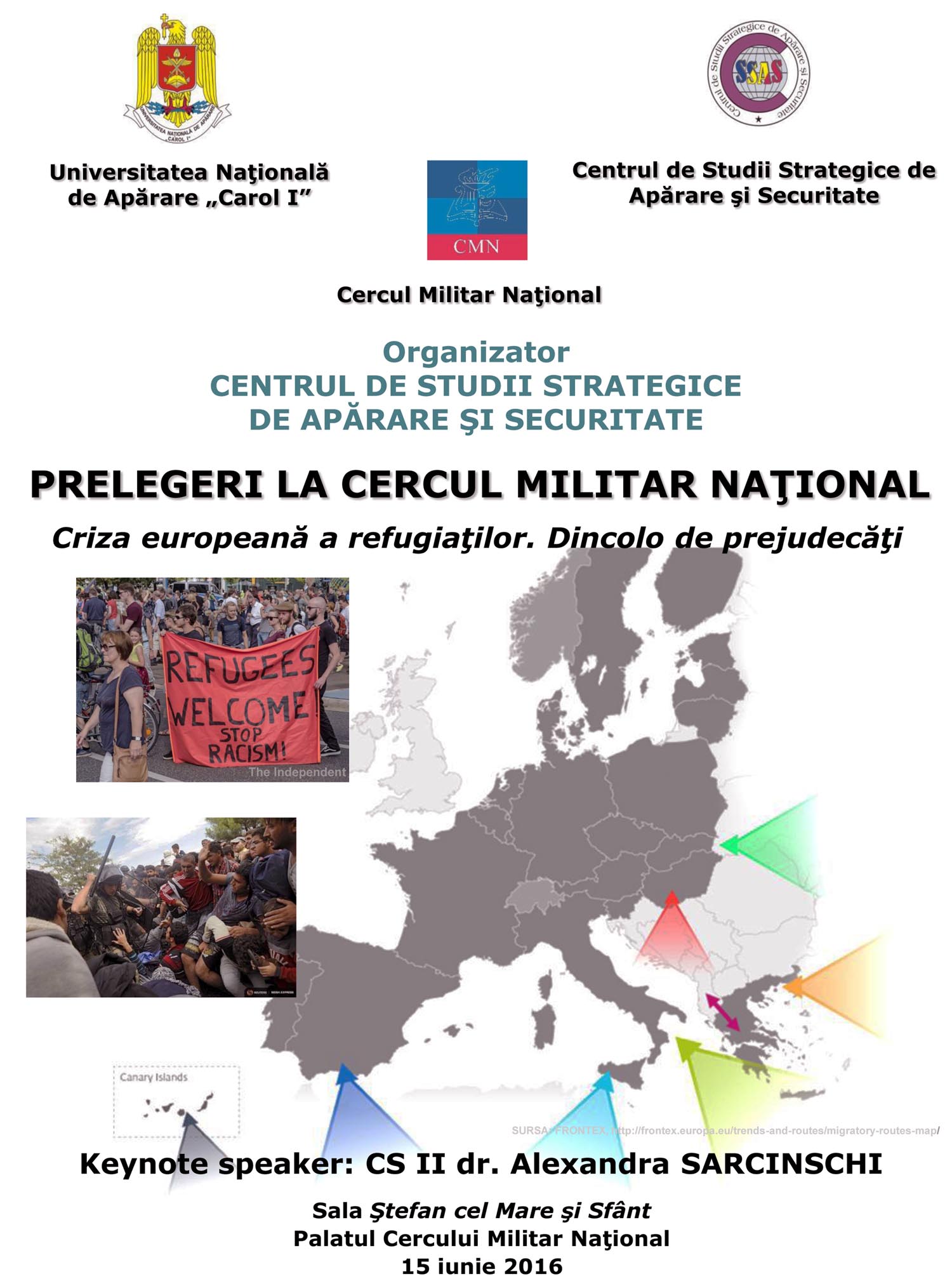 Prelegerea: „Criza europeană a refugiaţilor. Dincolo de prejudecăţi”, susţinută de cercetător dr. Alexandra Sarcinschi. Centrul de Studii Strategice de Apărare şi Securitate din Universitatea Naţională de Apărare „Carol I” organizează, la Cercul Militar Naţional, Sala „Ştefan cel Mare şi Sfânt”, un nou eveniment din seria Prelegeri la Cercul Militar Naţional. Scopul acestuia este, pe de o parte, de a disemina rezultatele cercetării ştiinţifice, iar, pe de altă parte, de a crea mediul favorabil dezbaterilor şi schimbului de opinii între persoanele cu preocupări în domeniu.