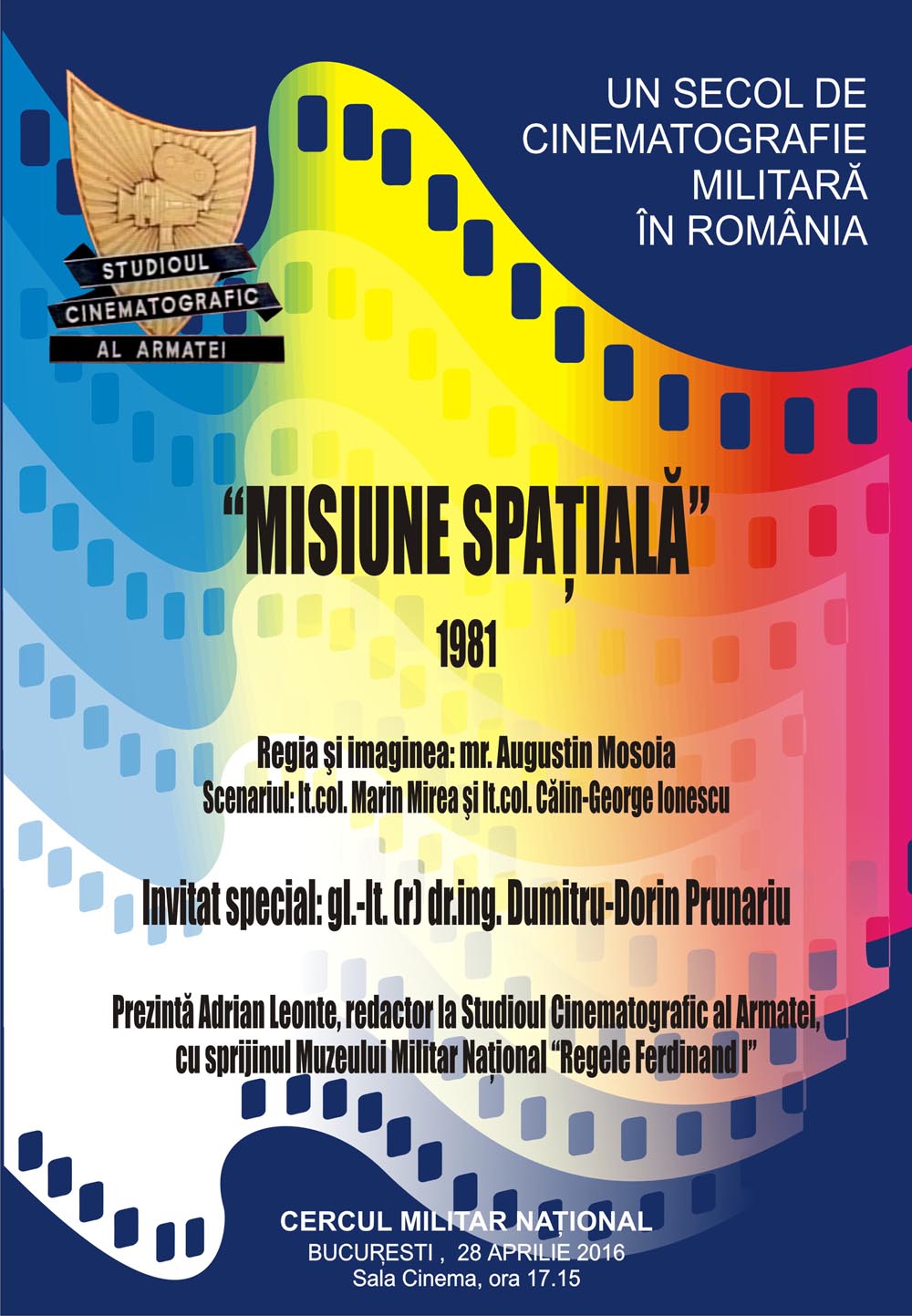 Joi, 28 aprilie 2016, ora 17.15, la Sala Cinema, va avea loc proiecția filmului Misiune spaţială, un scurtmetraj documentar realizat în anul 1981 de maiorul Augustin Mosoia, cu ocazia primului zbor în spaţiul cosmic al unui român. Invitat special: general-locotenent (r.) dr. ing. Dumitru-Dorin Prunariu. Prezintă: Adrian Leonte, redactor la Studioul Cinematografic al Armatei, cu sprijinul Muzeului Militar Naţional „Regele Ferdinand I”. Intrarea liberă. Fotografii realizate de Petrică Mihalache.