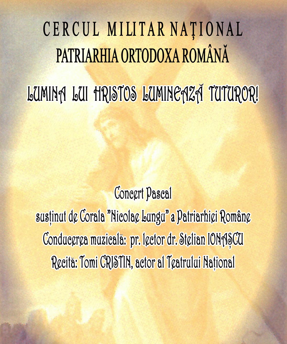 Conducerea muzicală: pr. lect. dr. Stelian Ionașcu. Recită și prezintă: Tomi Cristin, actor la Teatrul Național București.