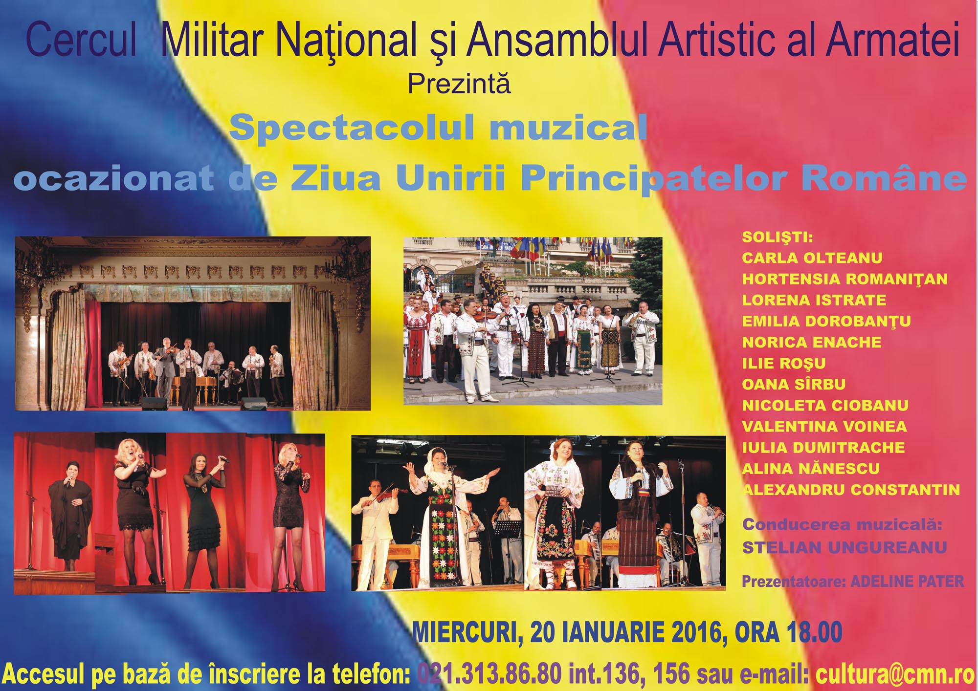 Miercuri, 20 ianuarie, ora 18.00, la Sala de Spectacole, are loc loc Spectacolul muzical susținut de Ansamblul Artistic al Armatei. Soliști: Carla Olteanu, Hortensia Romanițan, Lorena Istrate, Emilia Dorobanțu, Norica Enache, Ilie Roșu, Oana Sîrbu, Nicoleta Ciobanu, Valentina Voinea, Alina Nănescu, Iulia Dumitrache, Alexandru Constantin. Conducerea muzicală: Stelian Ungureanu. Prezintă: Adeline Pater. Eveniment organizat de Cercul Militar Național în parteneriat cu Ansamblul Artistic al Armatei.