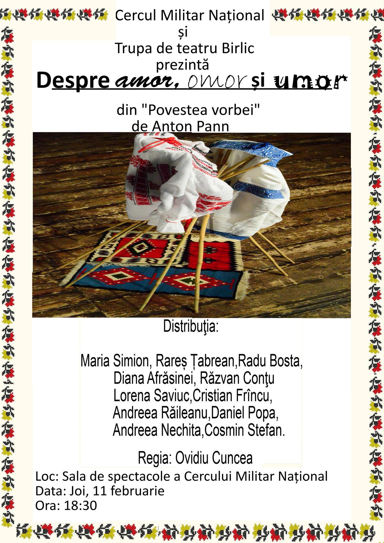 Joi, 11 februarie 2016, la Sala de Spectacole, Trupa de teatru „Birlic” din Fălticeni a prezentat spectacolul „Despre amor, omor și umor” din „Povestea vorbei” de Anton Pann, în regia lui Ovidiu Cuncea. Trupa de teatru Birlic a fost prezentă în București perioada 11 – 14 februarie 2016 cu ocazia împlinirii a 111 ani de la nașterea maestrului Grigore Vasiliu Birlic (25 ianuarie 1905). Eveniment a fost organizat de Cercul Militar Național în parteneriat cu Asociația Fălticeni Cultural. În nr. 7 al săptămânalului Observatorul Militar puteți citi articolul realizat de căpitan Cornelia Mihăilă despre spectacolul susținut la Cercul Militar Național.
