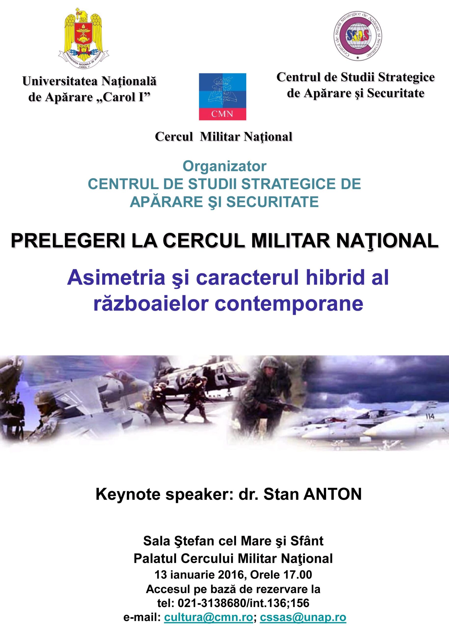 În data de 13.01.2016, începând cu orele 17.00, va avea loc cea de-a treia prelegere din anul universitar 2015 – 2016 și va avea ca temă: „Asimetria şi caracterul hibrid al războaielor contemporane”, susţinută de domnul dr. Stan ANTON, directorul Centrului de Studii Strategice de Apărare și Securitate.