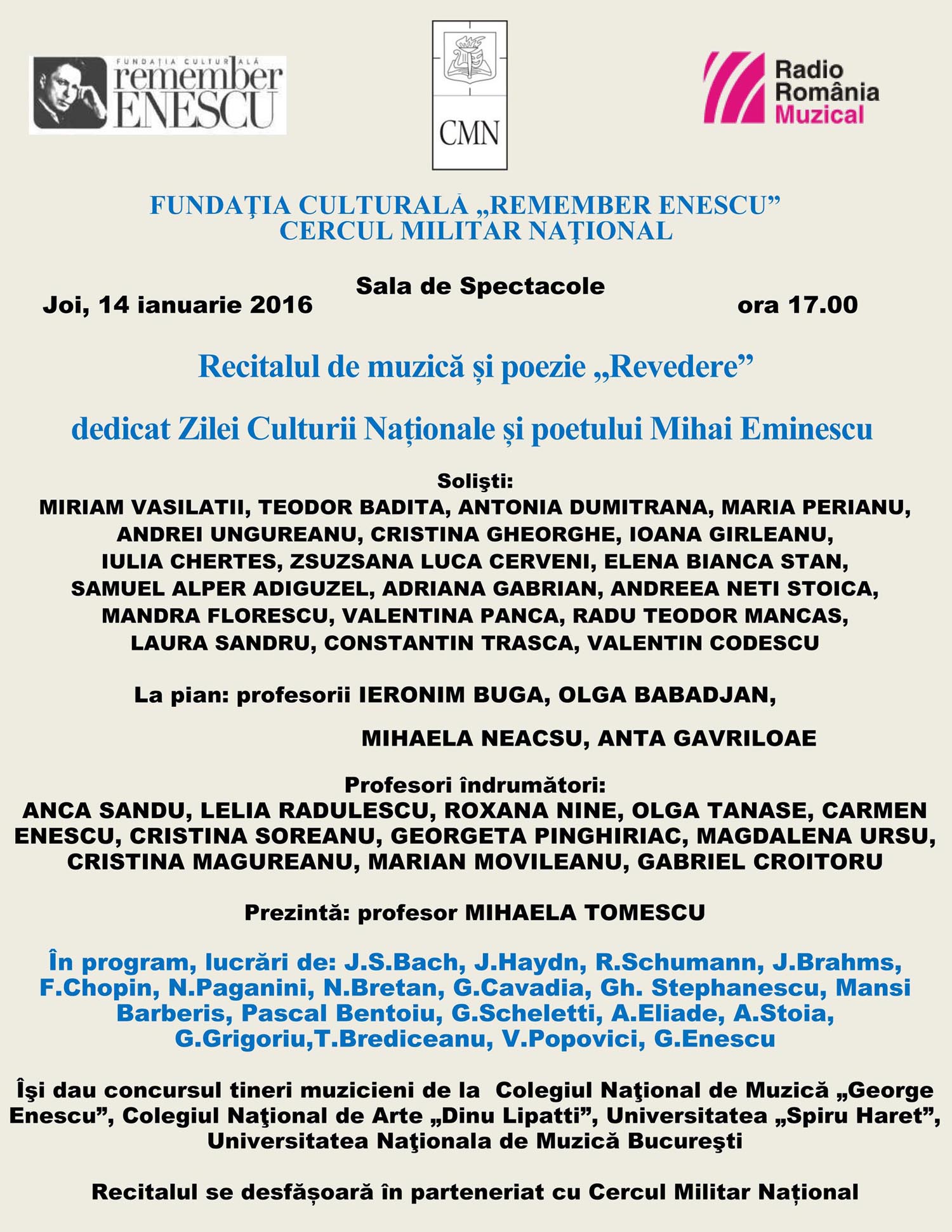Joi, 14 ianuarie, ora 17.00, la Sala de Spectacole, va avea loc Recitalul de muzică și poezie „Revedere”susținut de tineri muzicieni de la Universitatea Națională de Muzică din București, Universitatea „Spiru Haret”, Colegiul Național de Arte „Dinu Lipatti”și Colegiul Național de Arte „George Enescu”. În program, lucrări de: J.S.Bach, J.Haydn, R.Schumann, J.Brahms, F.Chopin, N.Paganini, N.Bretan, G.Cavadia, Gh. Stephanescu, Mansi Barberis, Pascal Bentoiu, G.Scheletti, A.Eliade, A.Stoia, G.Grigoriu,T.Brediceanu, V.Popovici, G.Enescu. Eveniment organizat de Cercul Militar Național în parteneriat cu Fundația Culturală „Remember Enescu”. Intrarea liberă.