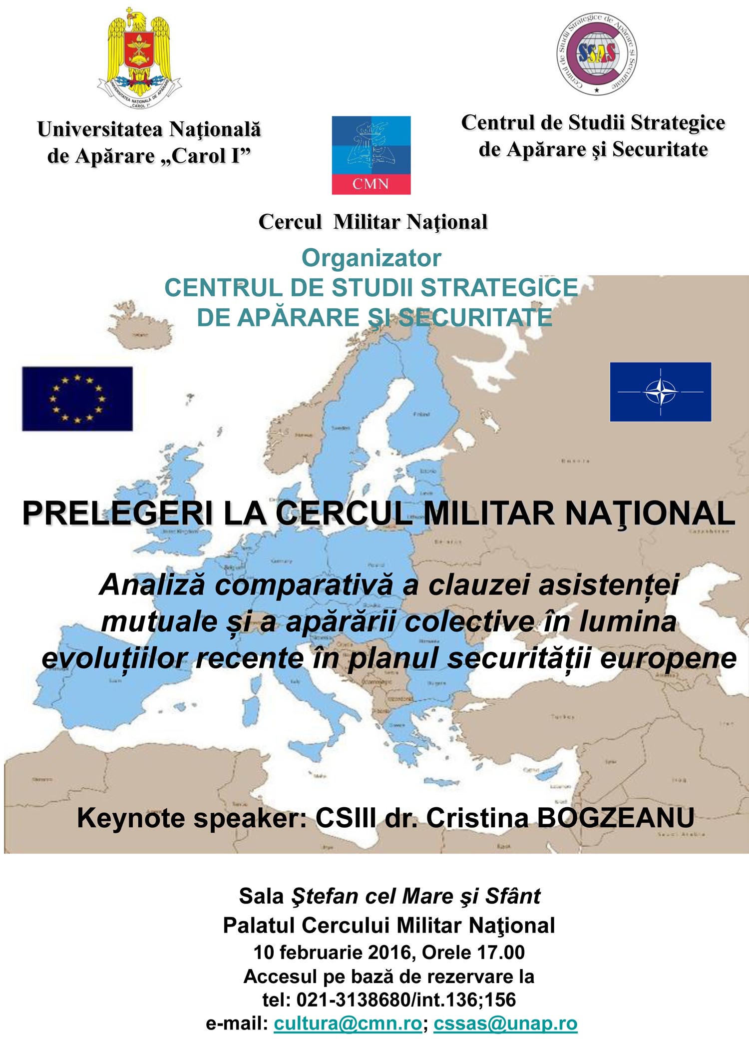 Centrul de Studii Strategice de Apărare şi Securitate din Universitatea Naţională de Apărare „Carol I” organizează, la Cercul Militar Naţional, Sala „Ştefan cel Mare şi Sfânt”, cel de-al 11-lea eveniment din seria „Prelegeri la Cercul Militar Naţional”. Scopul acestuia este, pe de o parte, de a disemina rezultatele cercetării științifice, iar, pe de altă parte, de a crea mediul favorabil dezbaterilor și schimbului de opinii între persoanele cu preocupări în domeniu. În data de 10.02.2016, începând cu ora 17.00, va avea loc cea de-a patra prelegere din anul universitar 2015 – 2016, cu tema: „Analiză comparativă a clauzei asistenței mutuale și a apărării colective în lumina evoluțiilor recente în planul securității europene”, susţinută de CSIII dr. Cristina BOGZEANU. Accesul pe bază de rezervare la telefon: 021.313.86.80, interioare 136, 156 sau e-mail:cultura@cmn.ro, cssas@unap.ro.