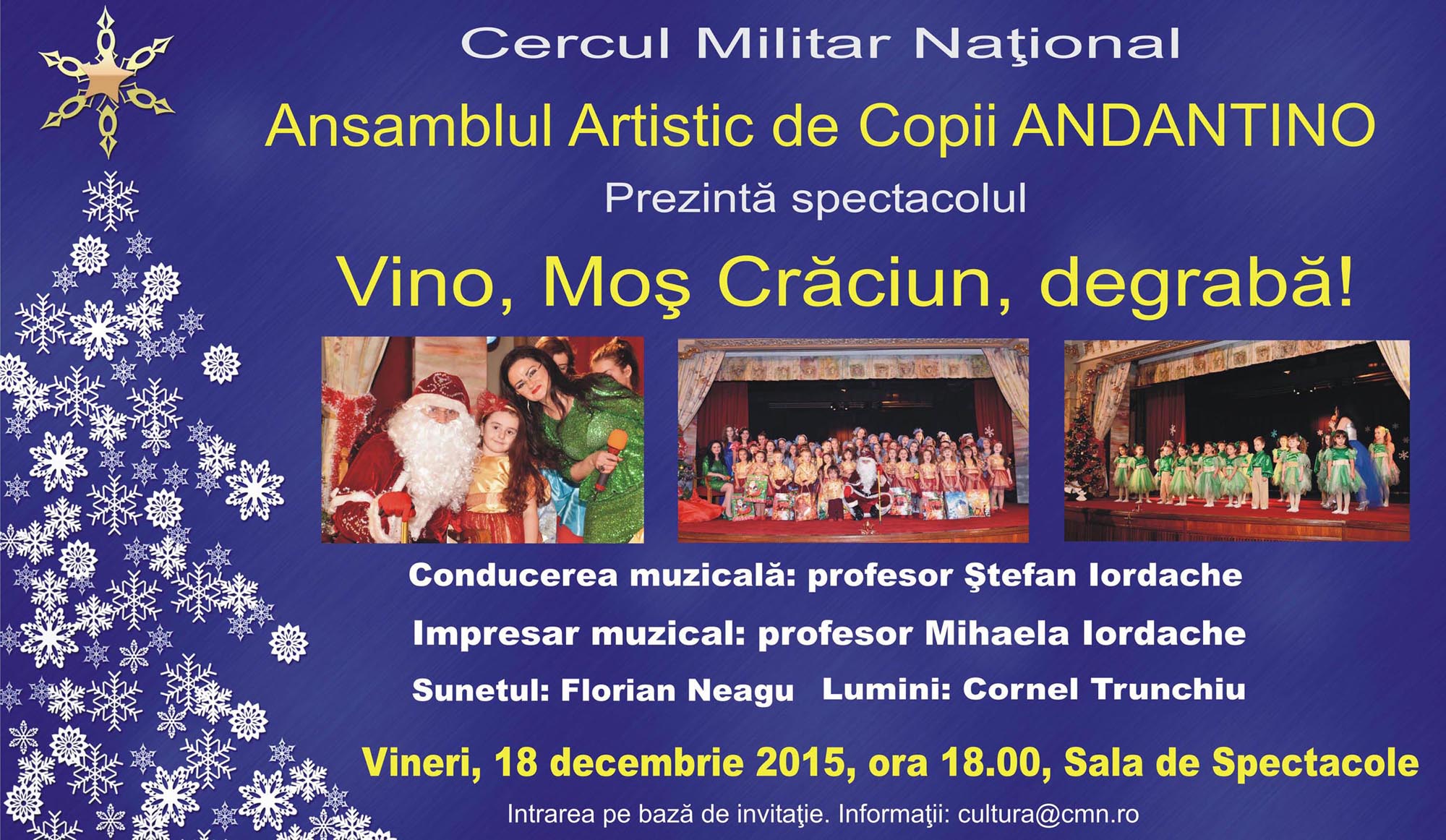 Vineri, 18 decembrie 2015, ora 18.00, la Sala de Spectacole, va avea loc spectacolul „Vino, Moș Crăciun, degrabă!” susținut de Ansamblul artistic de copii ANDANTINO.