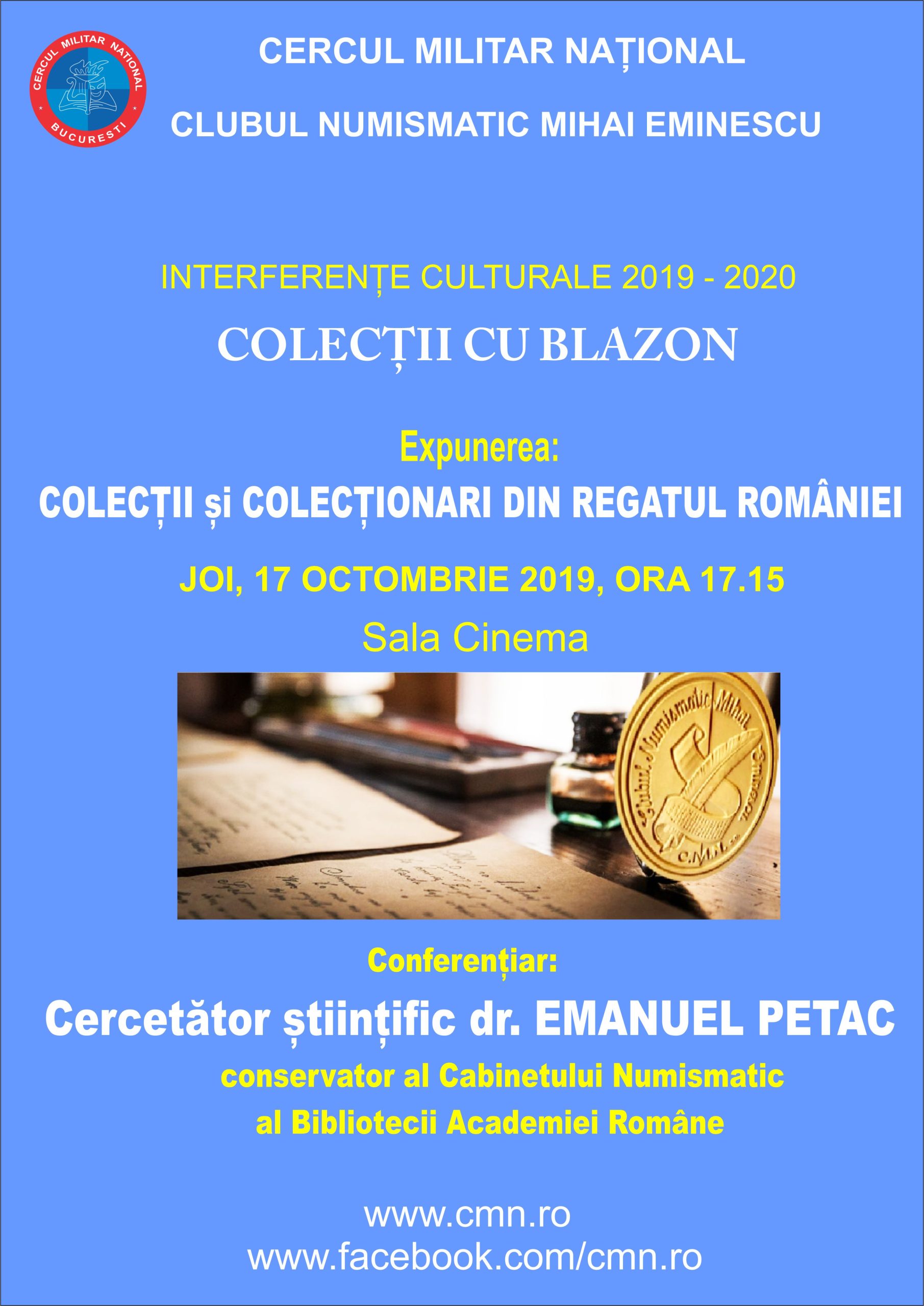 Noul program ″COLECȚII CU BLAZON″ reunește 8 expuneri care vor aborda, dintr-o nouă perspectivă, istoria unor colecții și vor fi susținute de invitați de marcă. Programul a fost gândit din dorința de a cunoaște oameni cu care să puteți dialoga despre pasiuni comune. De la monedă antică la moneda contemporană, de la manuscrise la carte veche românească, vom trece prin magica lume a colecțiilor românești și vom ajunge la istoria umanității. Expunerile sunt însoțite de imagini și filme documentare. Joi, 17 octombrie 2019, ora 17.15, la Sala Cinema, va avea loc prima expunere cu tema: ″Colecții și colecționari din Regatul României″ susținută de domnul cercetător științific dr. Emanuel Petac, conservator al Cabinetului Numismatic al Bibliotecii Academiei Române.