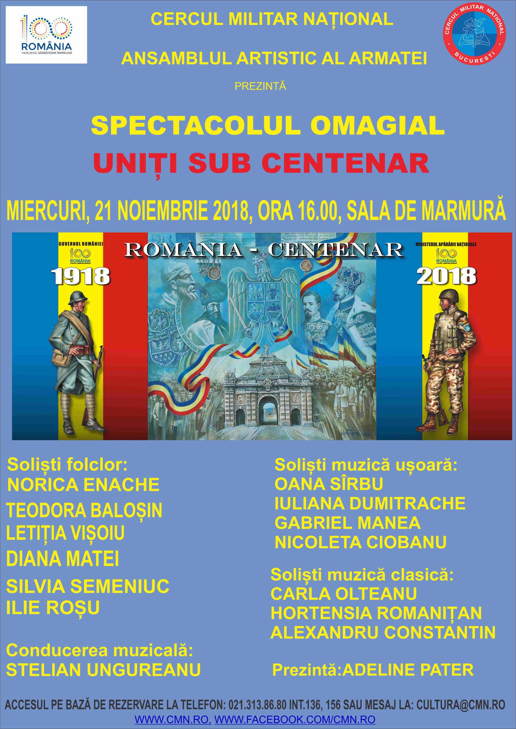 Miercuri, 21 noiembrie 2018, ora 16.00, la Sala de Marmură, va avea loc Spectacolul muzical susținut de Ansamblul Artistic al Armatei, cu ocazia sărbătoririi a 100 de ani de la Marea Unire. Conducerea muzicală: Stelian Ungureanu.