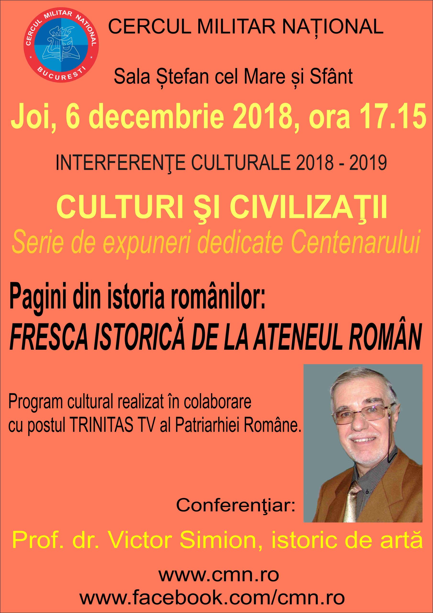 Joi, 6 decembrie 2018, ora 17.15, la Sala Ștefan cel Mare și Sfânt, va avea loc expunerea cu tema „Pagini din istoria românilor: Fresca istorică de la Ateneul Român”, susținută de prof. dr. Victor Simion, istoric de artă. Expunerea este însoțită de prezentarea unui film documentar. Programul cultural este realizat în colaborare cu postul Trinitas TV.