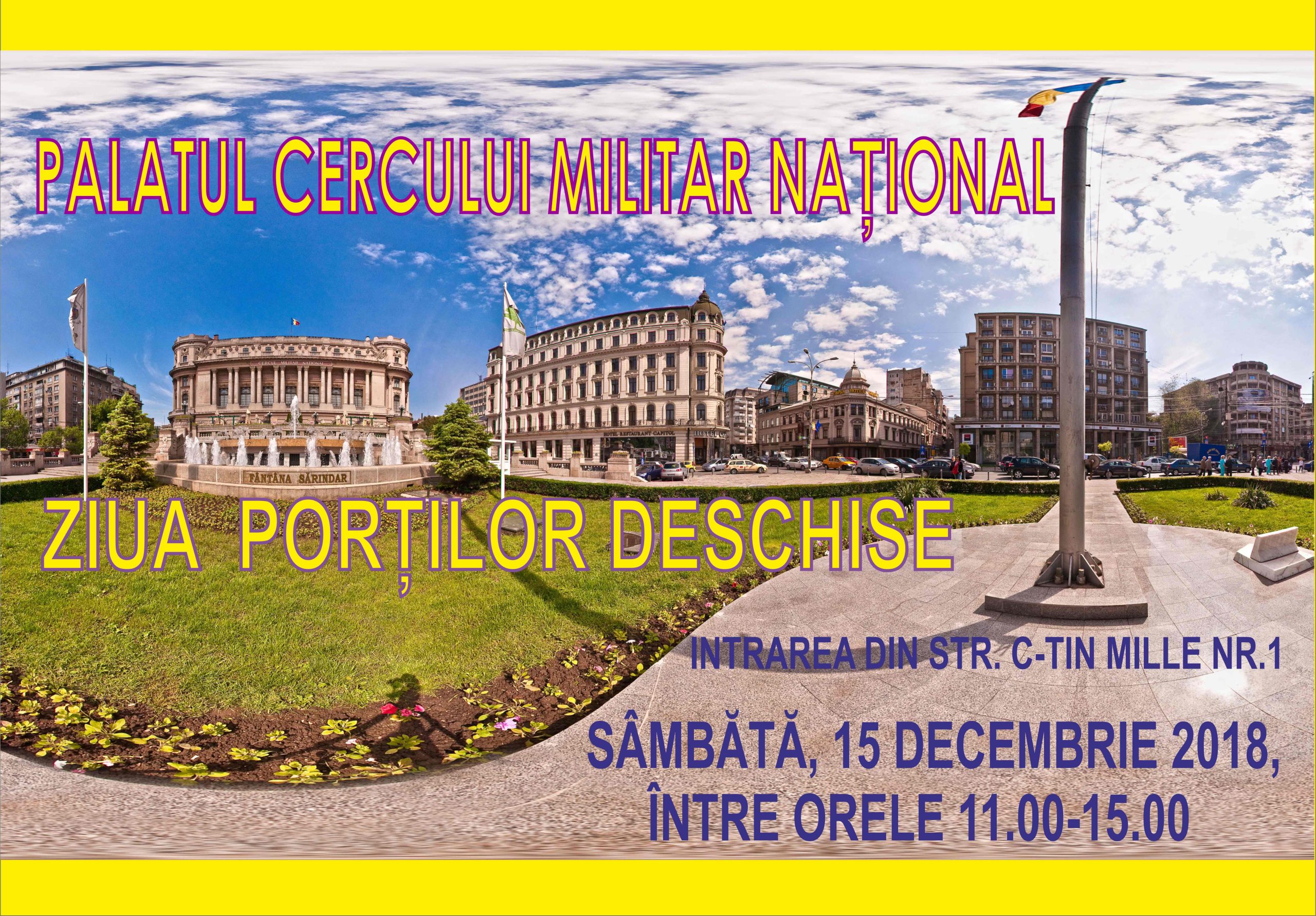 Sâmbătă, 15 decembrie 2018, între orele 11.00 – 15.00, veți putea vizita Palatul Cercului Militar Național, monument istoric și arhitectural, construit între anii 1911-1916, în stilul neoclasic francez, după planurile arhiectului Dimitrie Maimarolu, și inaugurat în anul 1923. Vă așteptăm!