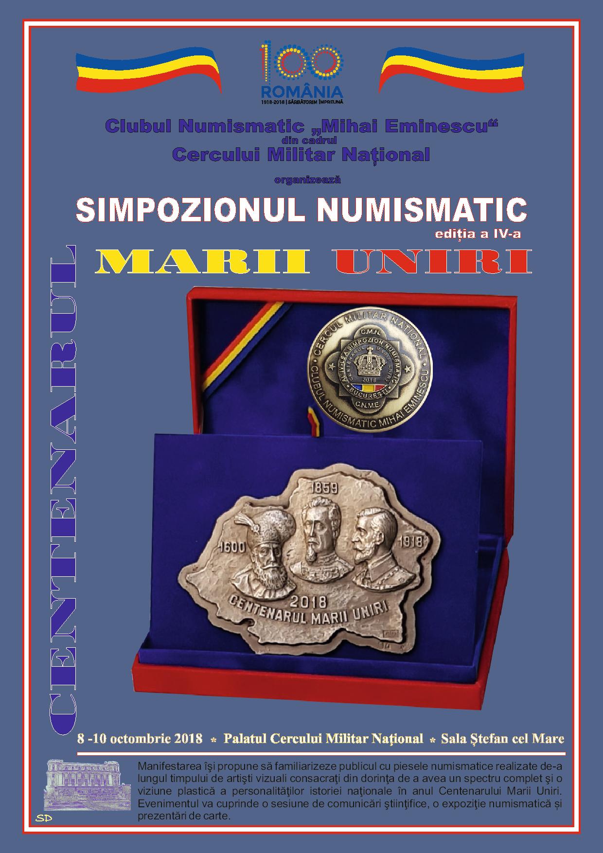 Clubul Numismatic „Mihai Eminescu” din cadrul Cercului Militar Național organizează, în perioada 8 – 10 octombrie 2018, la Sala Ștefan cel Mare, Simpozionul Numismatic dedicat Centenarului Marii Uniri. Evenimentul cuprinde o sesiune de comunicări ştiinţifice, o expoziţie numismatică și prezentări de carte.