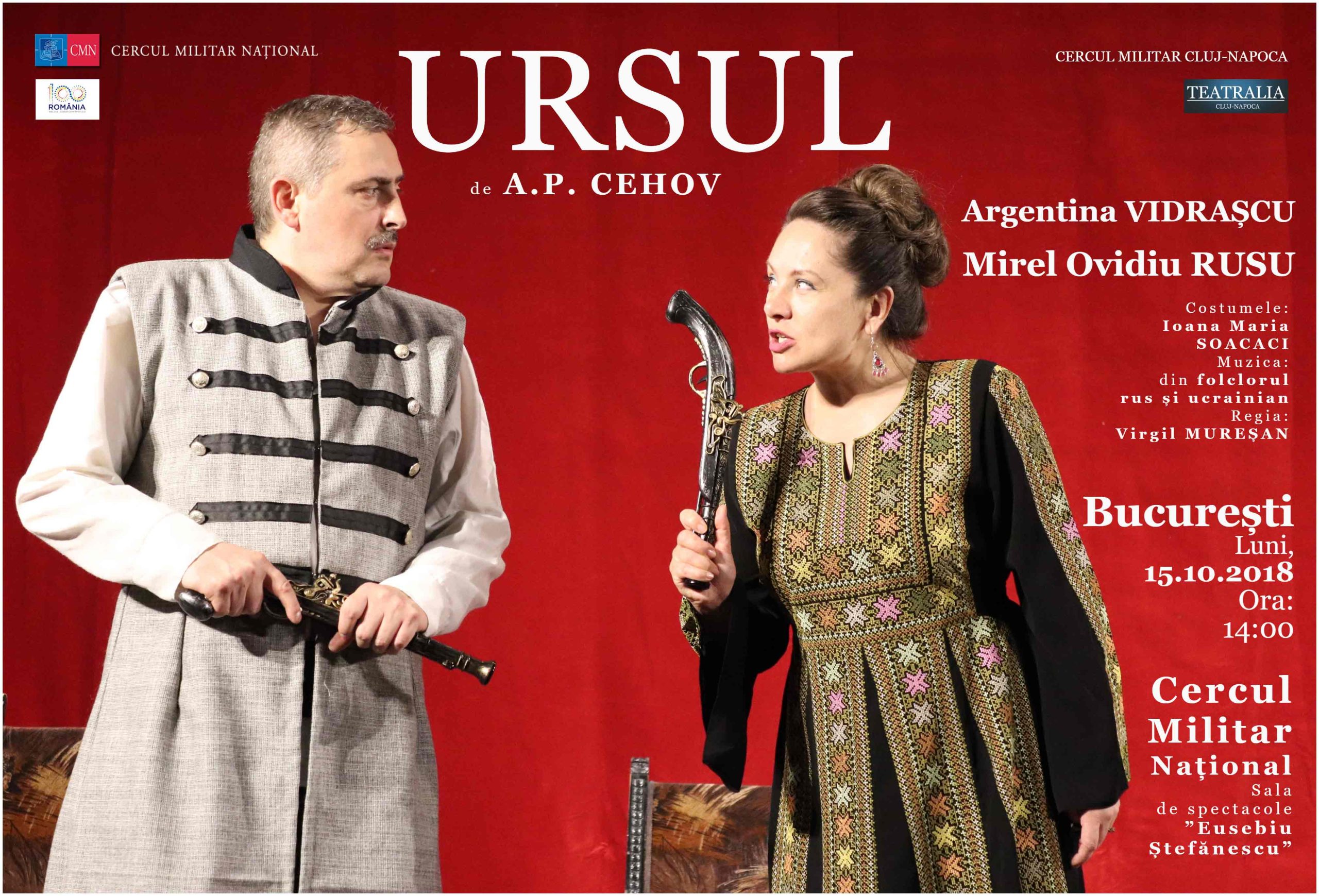 Luni, 15 octombrie 2018, ora 14.00, la Sala de Spectacole „Eusebiu Ștefănescu”, trupa de teatru TEATRALIA a Cercului Militar Cluj-Napoca prezintă comedia „URSUL” de A.P.CEHOV.