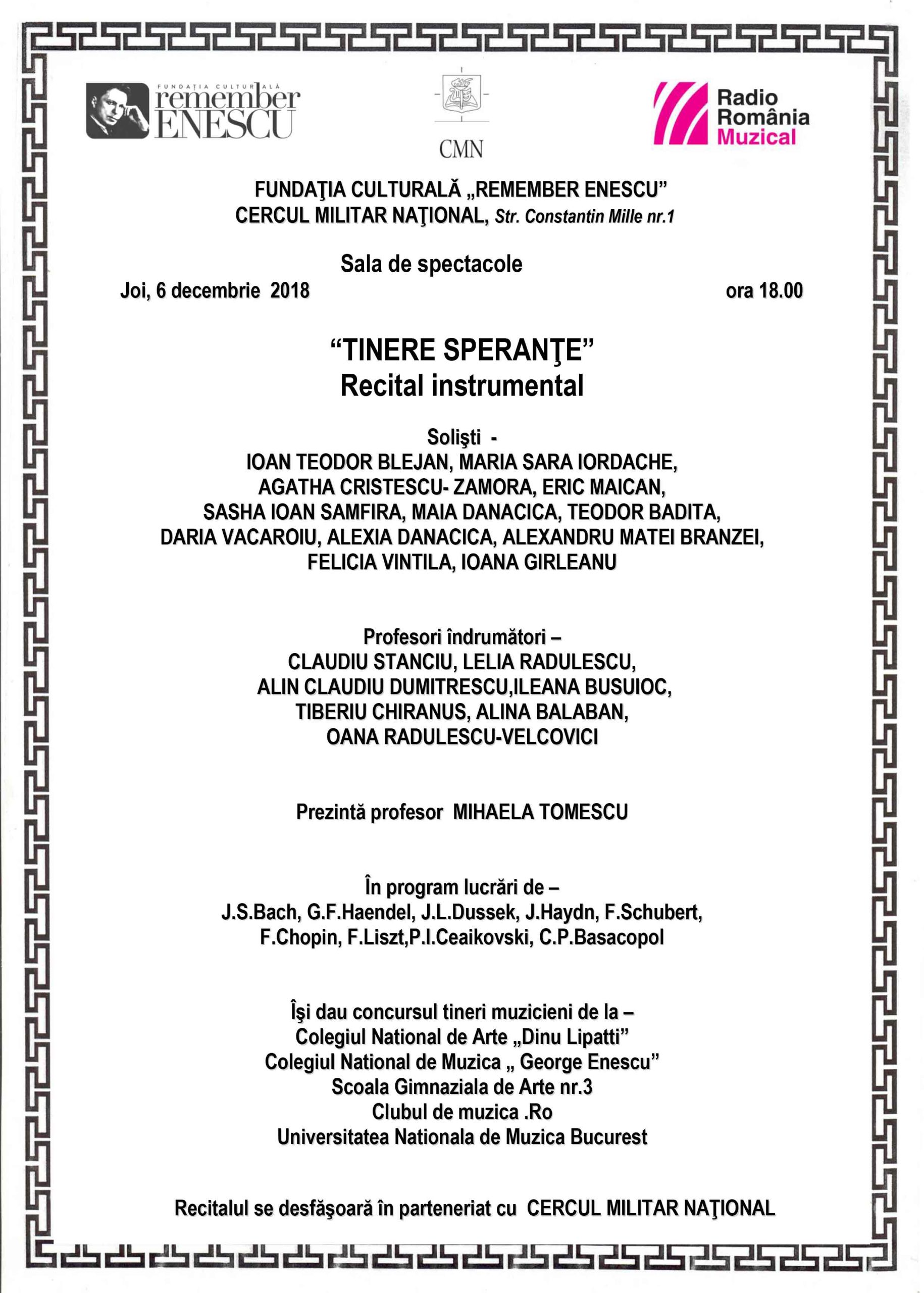 Joi, 6 decembrie 2018, ora 18.00, la Sala de Spectacole Eusebiu Ștefănescu, va avea loc Recitalul instrumental susținut de elevi și studenți de la Colegiul Național „Dinu Lipatti”, Colegiul Național „George Enescu”, Școala de Muzică nr.3, Clubuldemuzică.ro și de la Universitatea Națională de Muzică București. Evenimentul este realizat deFundația Culturală REMEMBER ENESCU, în parteneriat cu Cercul Militar Național, și are drept scop susținerea și promovarea tinerilor muzicieni. Intrarea liberă.