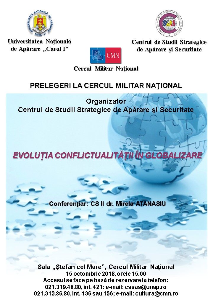 În data de 15.10.2018, începând cu orele 15.00, va avea loc cea de-a șaptea prelegere din anul 2018, cu tema: „Evoluția conflictualității în globalizare”, susținută de către CS II dr. Mirela ATANASIU.