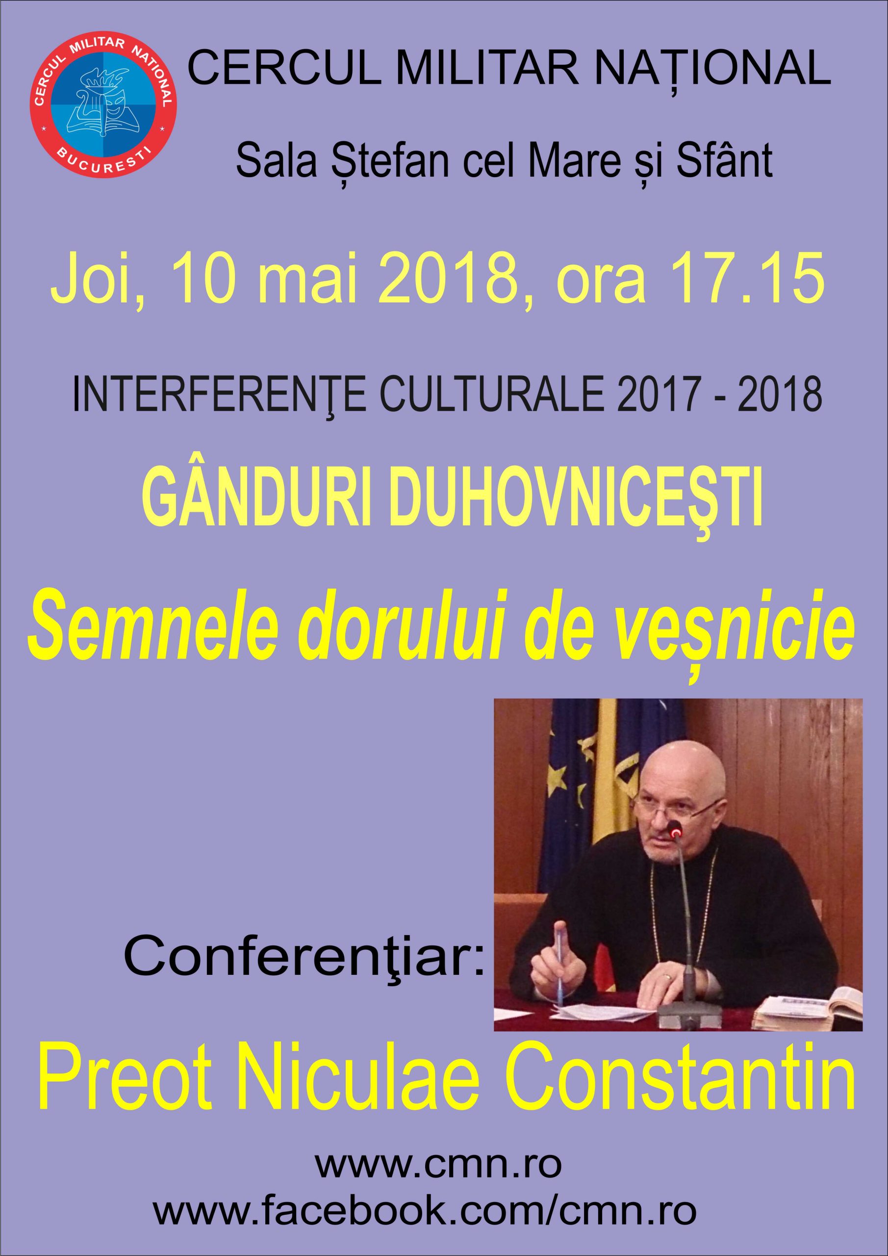 Joi, 10 mai 2018, ora 17.15, la Sala „Ștefan cel Mare și Sfânt”, va avea loc expunerea cu tema:„Semnele dorului de veșnicie” susținută de preot Niculae Constantin.