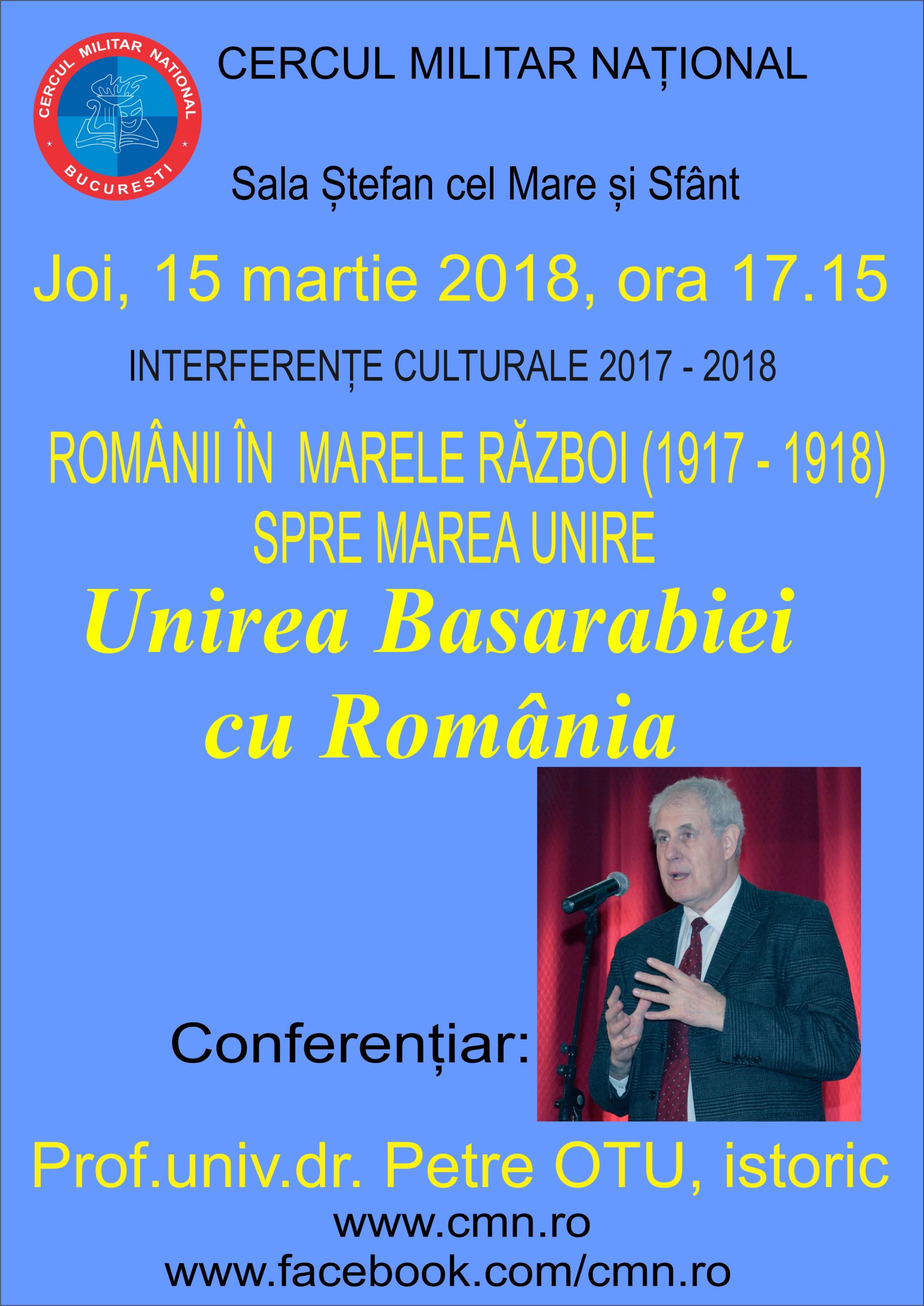 Joi, 15 martie 2018, ora 17.15, la Sala Ștefan cel Mare și Sfânt, va avea loc expunerea cu tema: ”Unirea Basarabiei cu România” susținută de prof.univ.dr. Petre Otu, istoric militar.