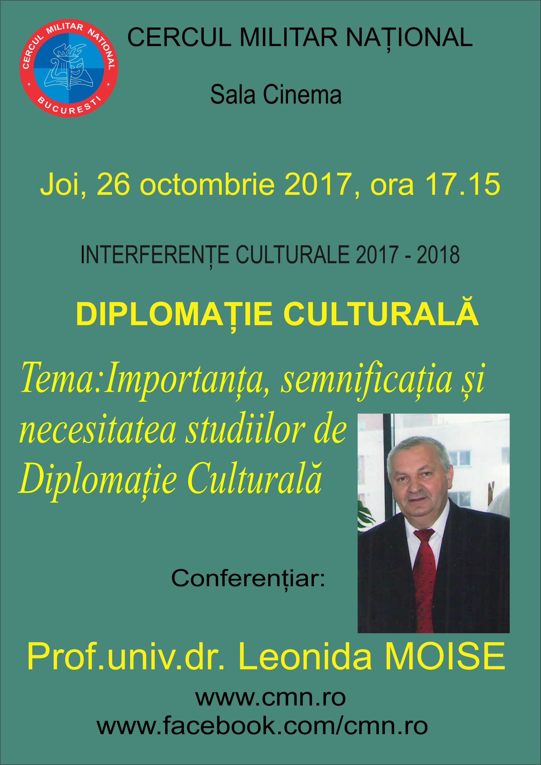 Joi, 26 octombrie 2017, ora 17.15, la Sala Cinema, va avea loc expunerea cu tema:”Importanța, semnificația și necesitatea studiilor de Diplomație Culturală”, susținută de prof.univ.dr. Leonida Moise: ”Într-o lume caracterizată de numeroase provocări, Diplomaţia culturală îşi propune ca obiectiv principal stabilirea, dezvoltarea şi susţinerea relaţiilor între state, între instituţii şi oameni prin cultură, artă, educaţie şi ştiinţă.”