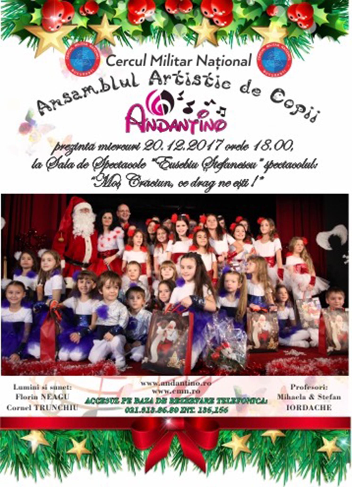 Miercuri, 20 decembrie 2017, ora 18.00, la Sala de Spectacole ”Eusebiu Ștefănescu”, va avea loc Spectacolul ”Moș Crăciun, ce drag ne ești!, susținut de Ansamblul Artistic de Copii Andantino. Profesori: Mihaela și Ștefan Iordache. Intrarea pe bază de rezervare la telefon: 021.313.86.80 int.136, 156 sau mesaj la adresa de e-mail: cultura@cmn.ro.
