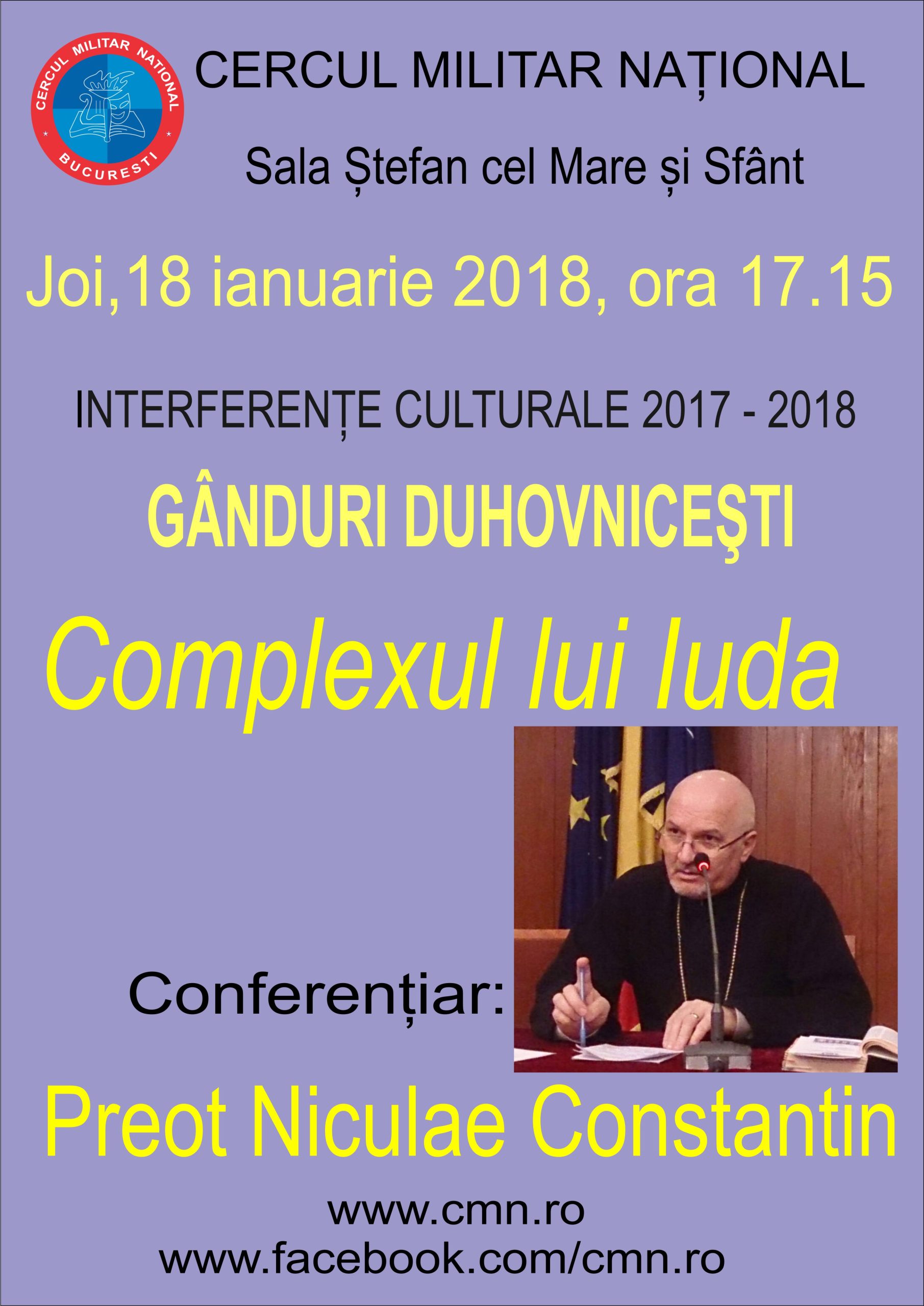 Joi, 18 ianuarie 2018, ora 17.15, la Sala Ștefan cel Mare și Sfânt, va avea loc expunerea cu tema:”Complexul lui Iuda”, susținută de preot Niculae CONSTANTIN. Intrarea liberă.
