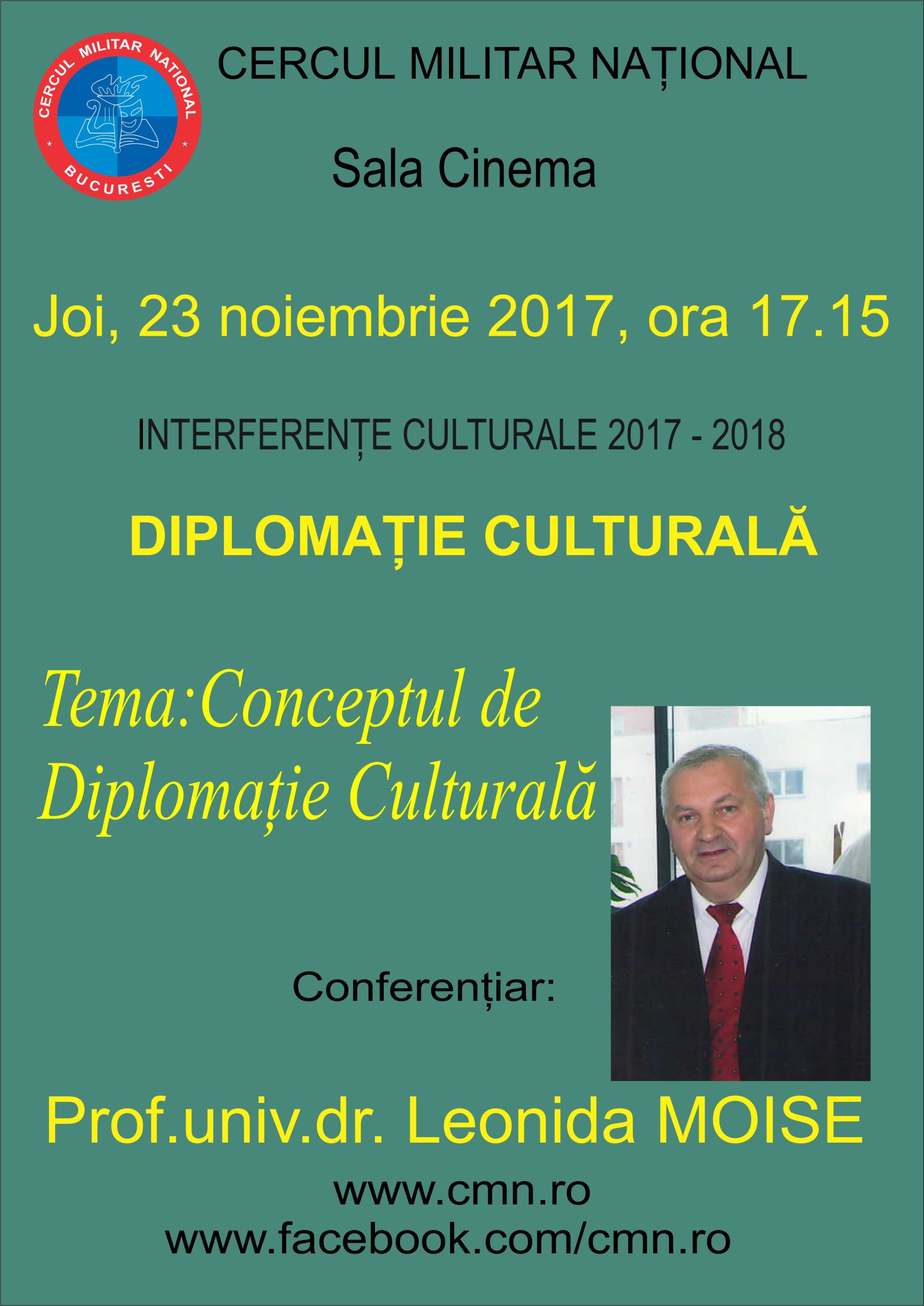 Joi, 23 noiembrie 2017, ora 17.15, la Sala Cinema, va avea loc expunerea cu tema:”Conceptul de Diplomație Culturală”, susținută de prof.univ.dr. Leonida Moise.