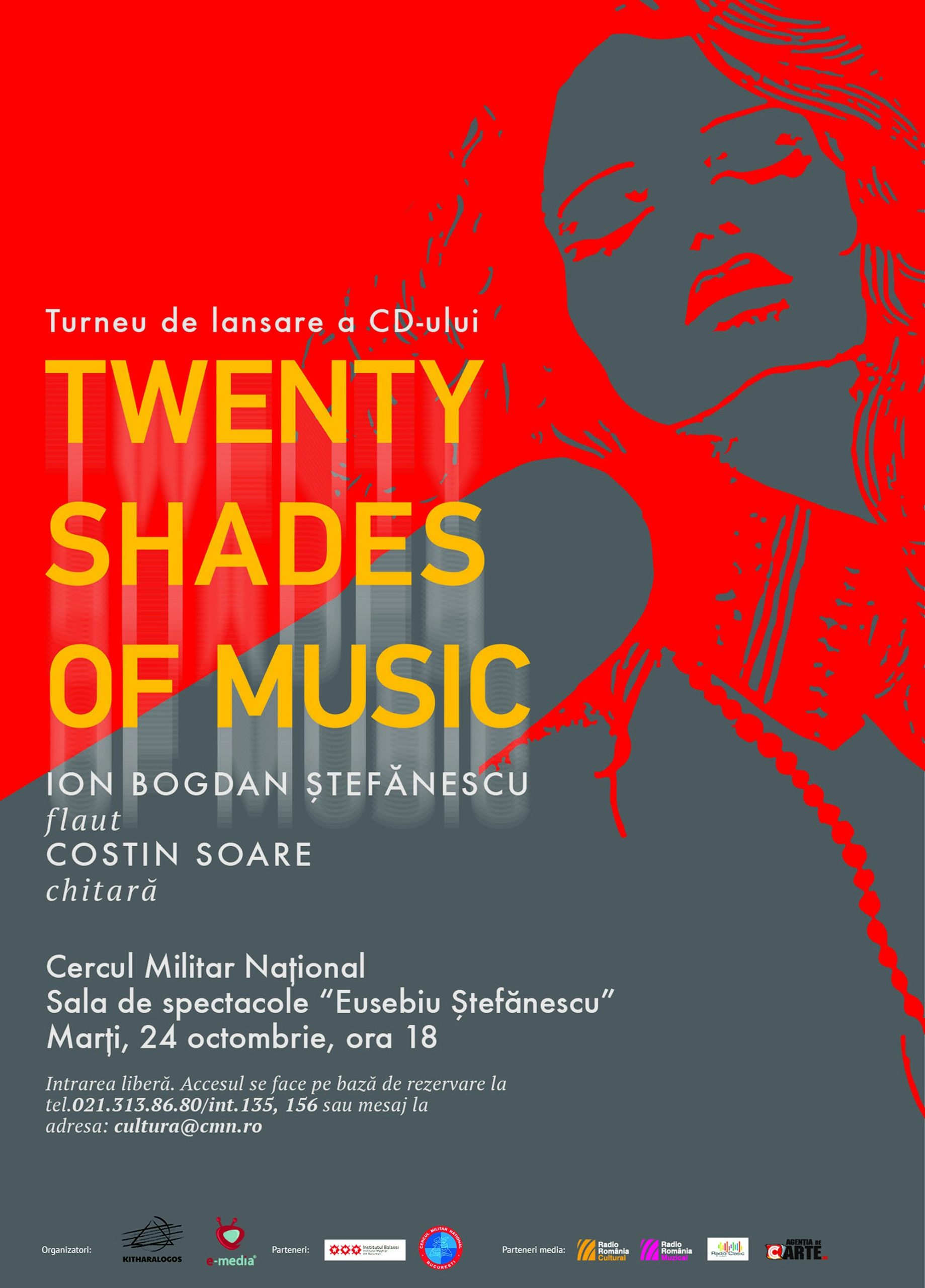 Marți, 24 octombrie 2017, ora 18.00, la Sala de Spectacole ”Eusebiu Ștefănescu”, va avea loc al treilea concert din cadrul turneului de lansarea a CD-ului ”Twenty Shades of Music”. Protagoniști: flautistul Ion Bogdan Ștefănescu și chitaristul Costin Soare. Eveniment organizat cu ocazia sărbătoririi Zilei Armatei României.