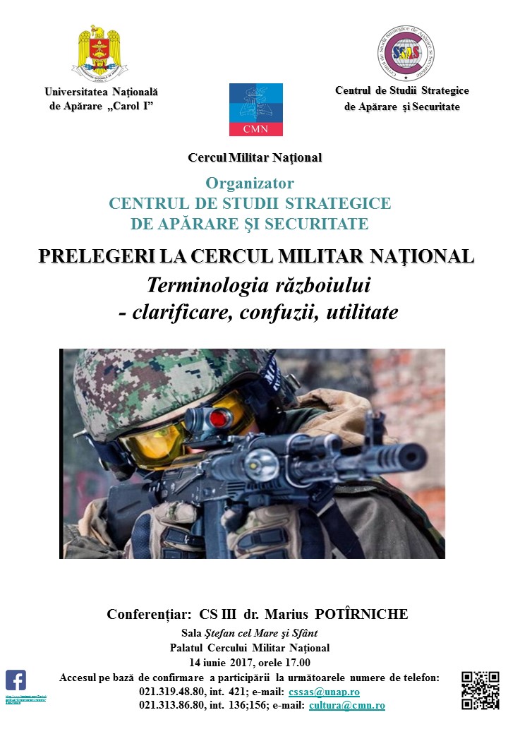 În data de 14.06.2017, începând cu orele 17.00, va avea loc cea de-a șasea prelegere din anul 2017, cu tema: „Terminologia războiului – clarificare, confuzii, utilitate”, susţinută de CS III dr. Marius POTÎRNICHE. În cadrul acestei prelegeri se va aduce în dezbatere tendința de a defini și clasifica conflictul armat, în contradicție cu aspectul practic, planificarea și desfasurarea acestuia. De asemenea se vor detalia principiile care guvernează noile conflicte armate moderne și tipologia acestora, ca rezultat al legilor de ducere a războiului și a problemelor prezente și viitoare ale societății în care trăim. Accesul se face pe bază de confirmare a participării la următoarele numere de telefon: 021.319.48.80, int. 421; e-mail: cssas@unap.ro sau 021.313.86.80, int.136;156; e-mail: cultura@cmn.ro