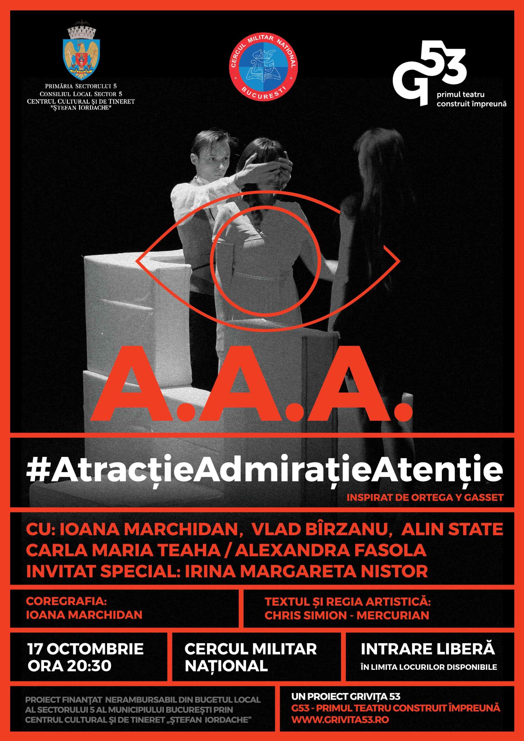 Marți, 17 octombrie 2017, ora 20.30, la Sala de Spectacole ”Eusebiu Ștefănescu” va fi prezentat spectacolul de teatru ”A.A.A. – AtracțieAdmirațieAtenție”, o lecție de gramatică a iubirii, text inspirat din ”Studii despre iubire” de Jose Ortega Y Gasset. Regia și textul: Chris Simion-Mercurian. Invitat special: Irina Margareta Nistor. Intrarea liberă, pe bază de înscriere la telefon 021.313.86.80 interioare :136, 156 sau mesaj la cultura@cmn.ro.