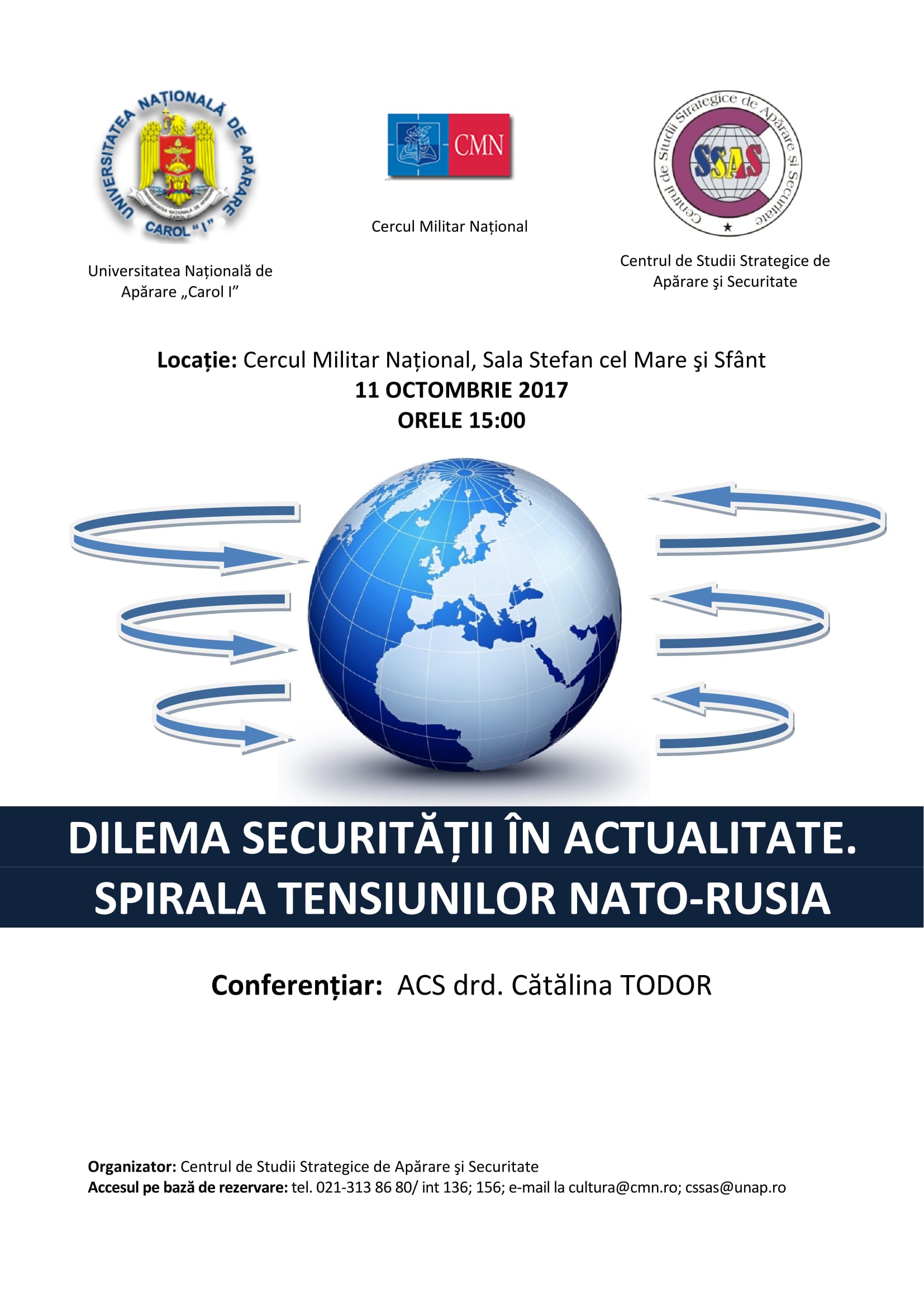 Miercuri, 11 octombrie 2017, ora 15.00, la Sala Ștefan cel Mare și Sfânt, se va desfășura prelegerea cu tema: „Dilema securității în actualitate. Spirala tensiunilor NATO – Rusia”, susţinută de ACS drd. Cătălina TODOR. Accesul se face pe bază de confirmare a participării la următoarele numere de telefon și adrese de e-mail: 021.319.48.80, int. 421; e-mail: cssas@unap.ro; telefon: 021.313.86.80, int.136;156; e-mail: cultura@cmn.ro
