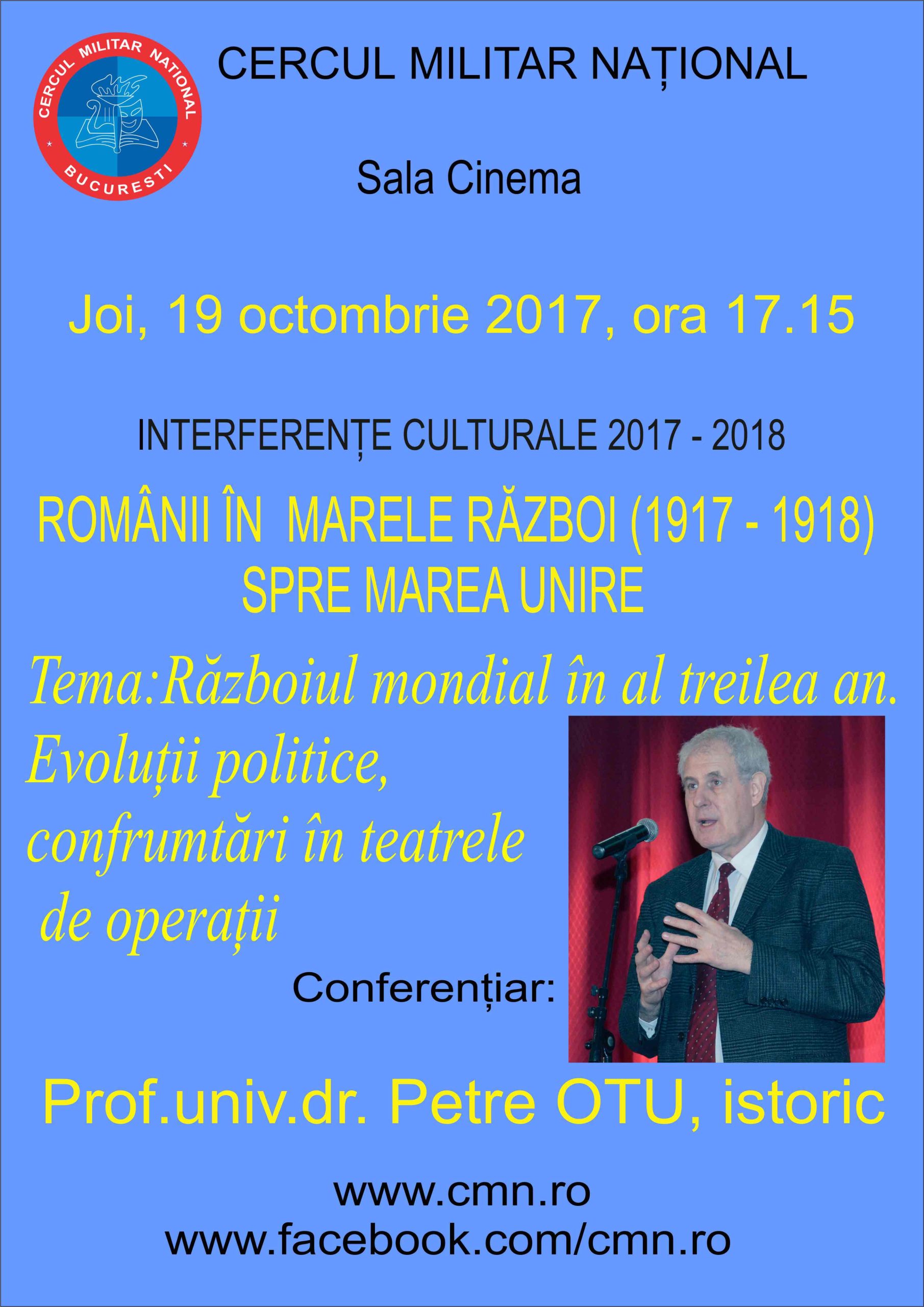 Joi, 19 octombrie 2017, ora 17.15, la Sala Cinema, va avea loc expunerea cu tema:”Războiul mondial în al treilea an. Evoluții politice, confruntări pe teatrele de operații”. Conferențiarul, prof.univ.dr. Petre Otu, istoric militar, va susține în deschidere o alocuțiune referitoare la semnificația Zilei Armatei României – 25 octombrie. Intrarea liberă.