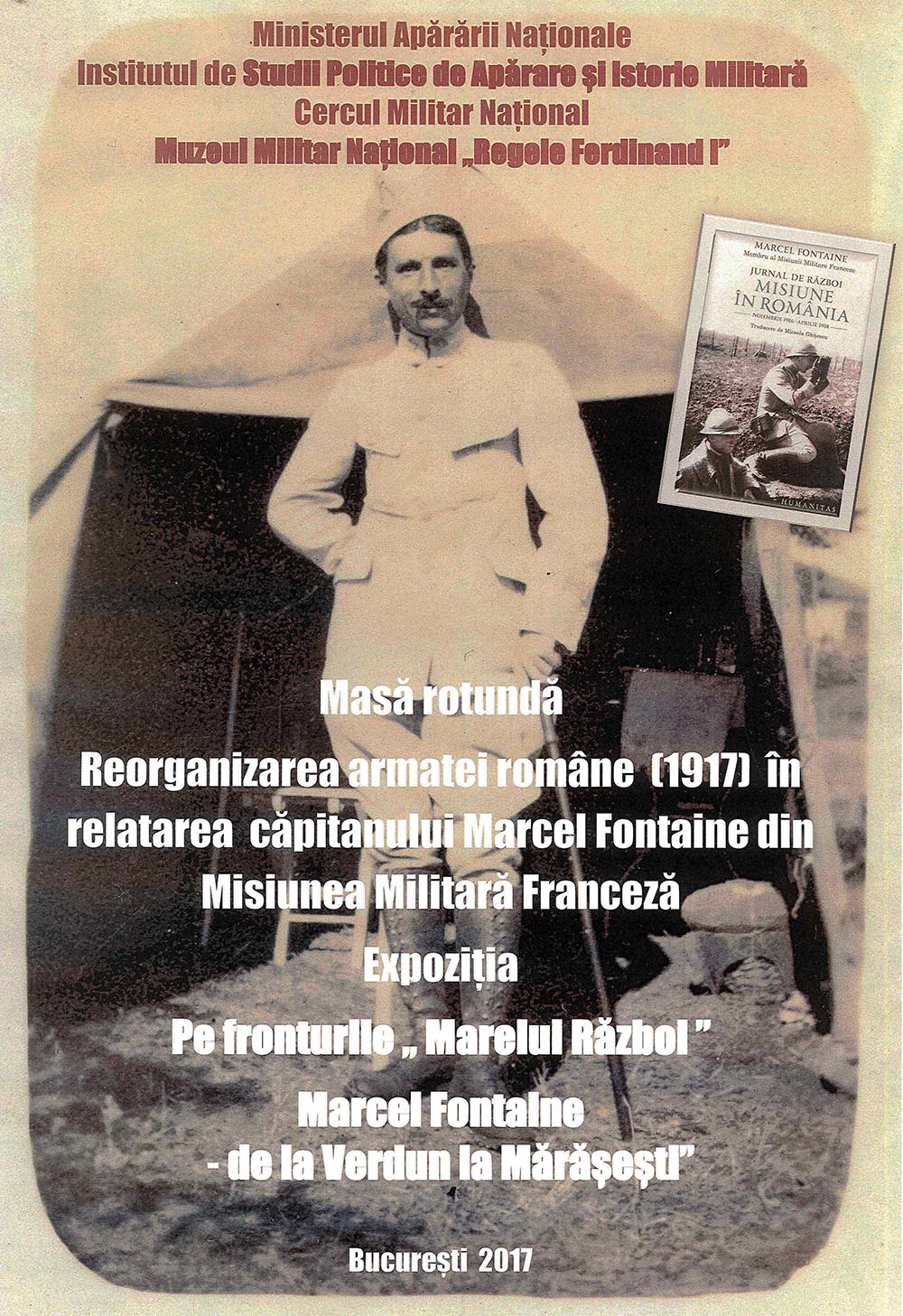 Joi, 30 martie 2017, ora 14.00, la Sala de Marmură, are loc Masa rotundă ”Reorganizarea armatei române în iarna anului 1917. Viziunea lui Marcel Fontaine”. Totodată, va fi vernisată și expoziția dedicată comemorării Centenarului Primului Război Mondial, ce conține și donația de fotografii ale lui Marcel Fontaine, membru al Misiunii Militare Franceze în România. Evenimentul este organizat de Institutul pentru Studii Politice de Apărare și Istorie Militară, Muzeul Militar Național ”Regele Ferdinand I” și Cercul Militar Național.