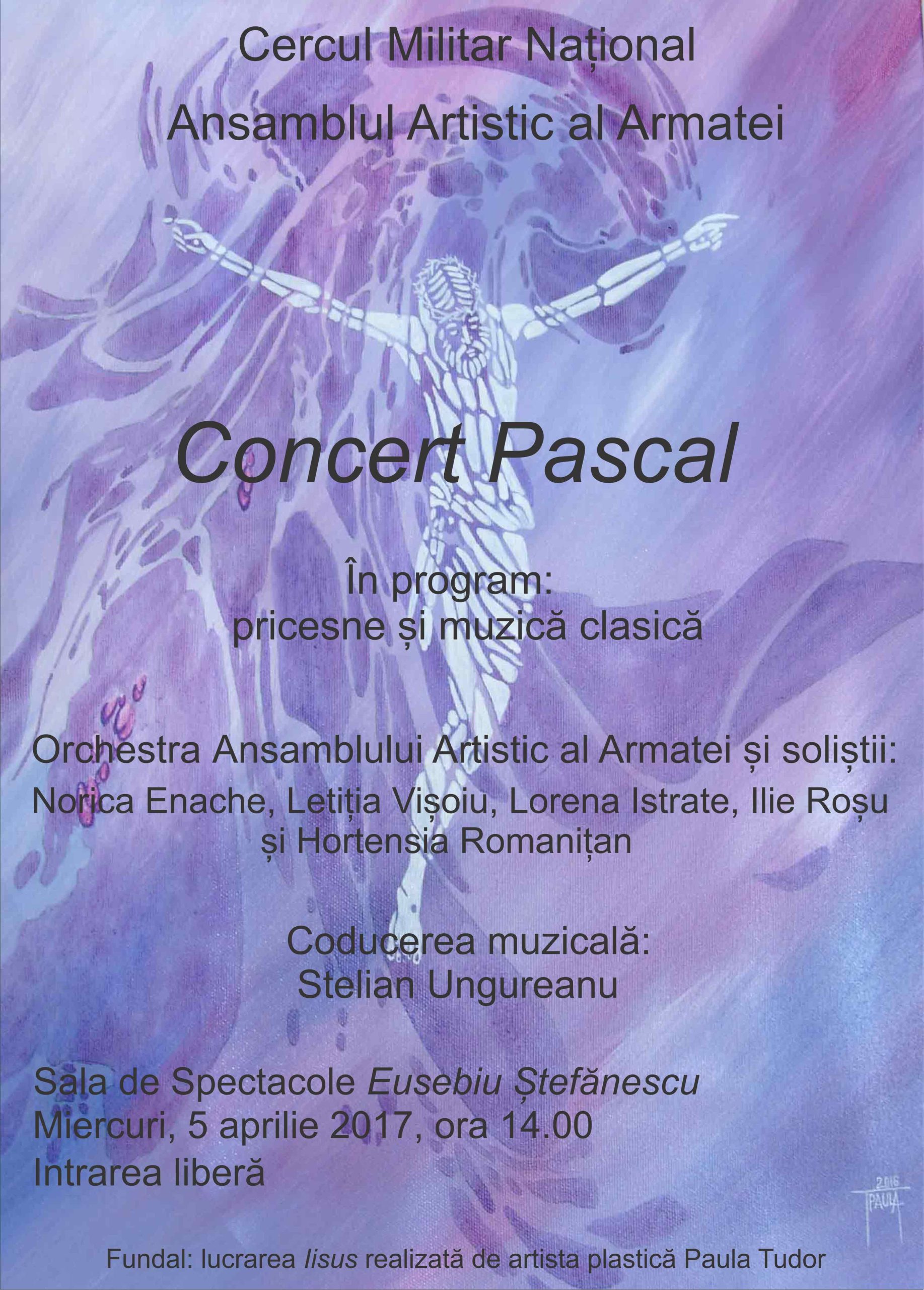 Miercuri, 5 aprilie 2017, ora 14.00, la Sala de Spectacole ”Eusebiu Ștefănescu”, va avea loc Concertul ocazionat de Sărbătorile Pascale, susținut de orchestra și soliștii Ansamblului Artistic al Armatei: Norica Enache, Letiția Vișoiu, Lorena Istrate, Silvia Semeniuc, Teodora Baloșin, Ilie Roșu, Gabriel Manea, Alexandru Constantin și Hortensia Romanițan. În program: pricesne și muzică clasică.