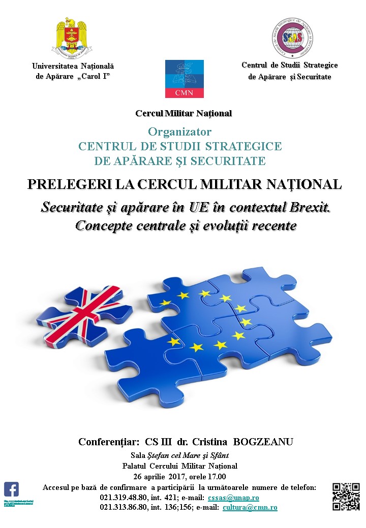 În data de 26.04.2017, începând cu ora 17.00, va avea loc cea de-a patra prelegere din anul 2017, cu tema: „Securitateși apărare în UE în contextul Brexit. Concepte centrale și evoluții recente”, susţinută de CS III dr. Cristina BOGZEANU.