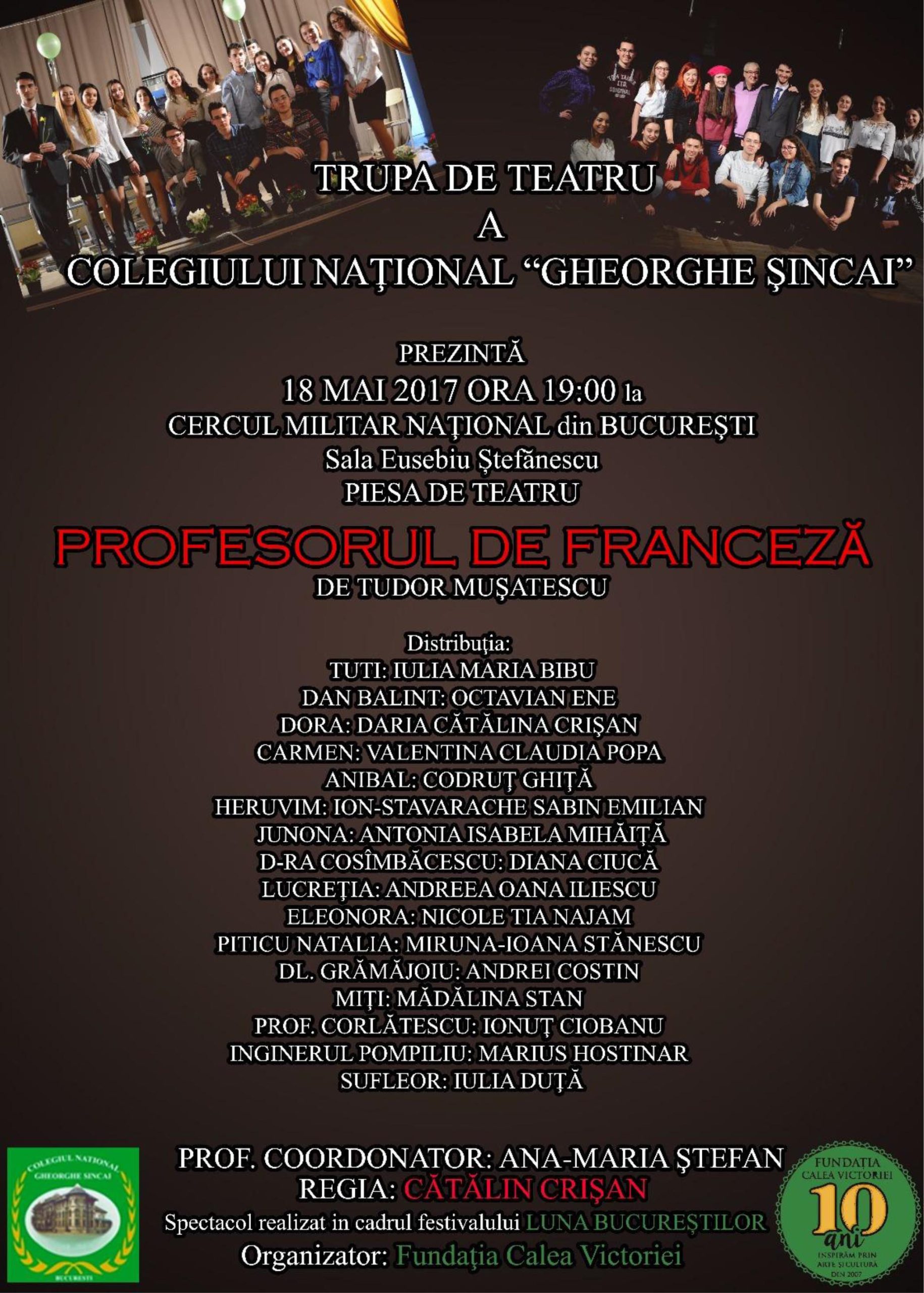 Joi, 18 mai 2017, ora 19.00, la Sala de Spectacole ”Eusebiu Ștefănescu”, are loc prezentarea Piesei de teatru ”Profesorul de franceză”, susținută de Trupa de Teatru a Colegiului Național ”Gheorghe Șincai”. Regizor: Cătălin Crișan. Eveniment organizat în parteneriat cu Fundația Calea Victoriei, în cadrul Festivalului Luna Bucureștilor 2017
