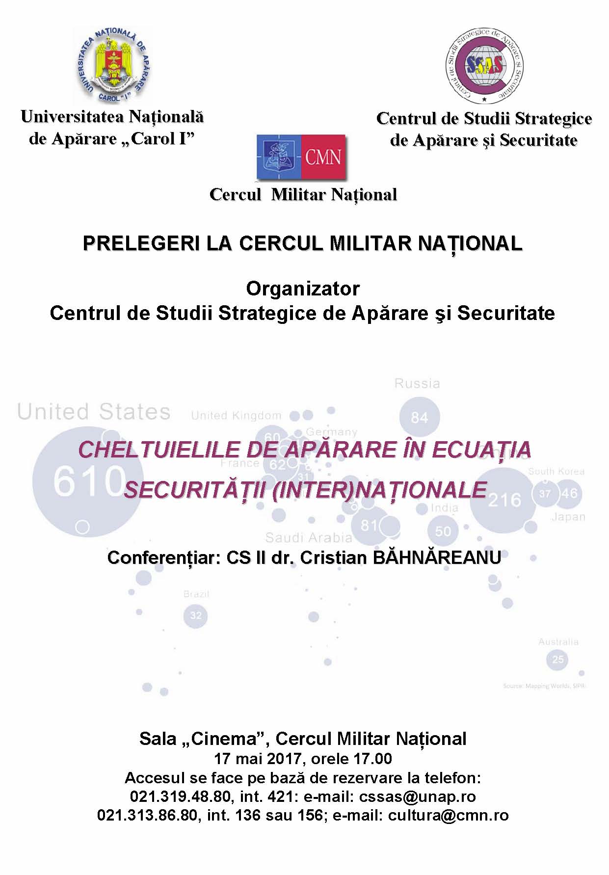 Centrul de Studii Strategice de Apărare şi Securitate din Universitatea Naţională de Apărare „Carol I” organizează, la Cercul Militar Naţional, Sala Cinema, un nou eveniment din seria „Prelegeri la Cercul Militar Naţional”. Scopul acestuia este, pe de o parte, de a disemina rezultatele cercetării ştiinţifice, iar, pe de altă parte, de a crea mediul favorabil dezbaterilor şi schimbului de opinii între persoanele cu preocupări în domeniul studiilor strategice şi de securitate. În data de 17.05.2017, începând cu ora 17.00, va avea loc cea de-a cincea prelegere din anul 2017, cu tema: ”Cheltuielile de apărare în ecuaţia securităţii (inter)naţionale”, susţinută de CS II dr. Cristian BĂHNĂREANU. Accesul se face pe bază de confirmare a participării la următoarele numere de telefon și adrese de e-mail: 021.319.48.80, int. 421; e-mail: cssas@unap.ro sau 021.313.86.80, int.136;156; e-mail: cultura@cmn.ro.