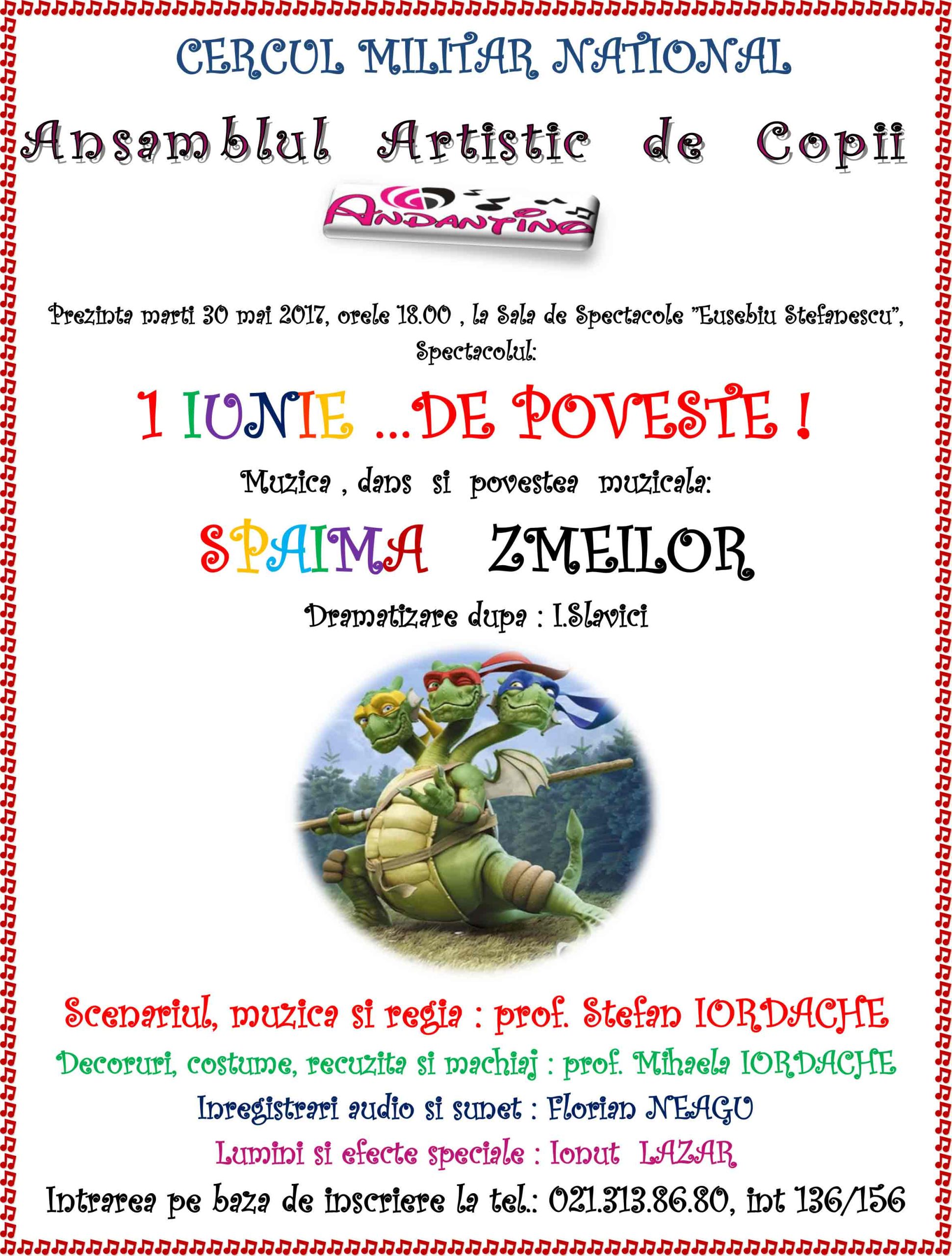 În program: muzică, dans și povestea muzicală ”Spaima zmeilor”, dramatizare după Ioan Slavici. Scenariul, muzica și regia: profesor Ștefan Iordache. Intrarea se face pe bază de înscriere la telefon: 021.313.86.80 int. 136 sau 156 sau mesaj la adresa: cultura@cmn.ro.