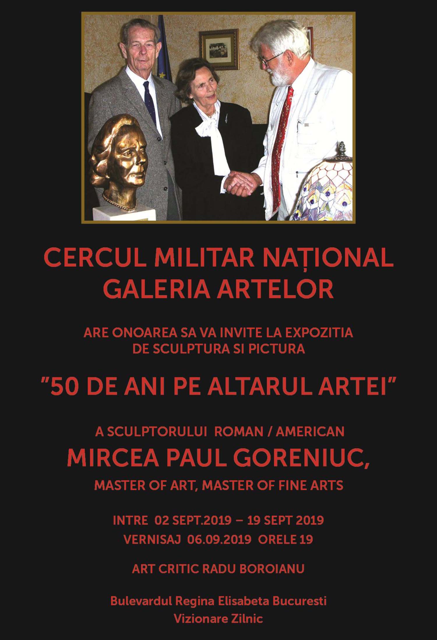 Expoziția de sculptură și pictură ″50 de ani pe altarul artei″ a artistului plastic Mircea Paul Goreniuc, deschisă în perioada 2 – 19 septembrie 2019. Vernisajul va avea loc la data 6 septembrie a.c., ora 19.00. Prezintă: criticul de artă Radu Boroianu.
