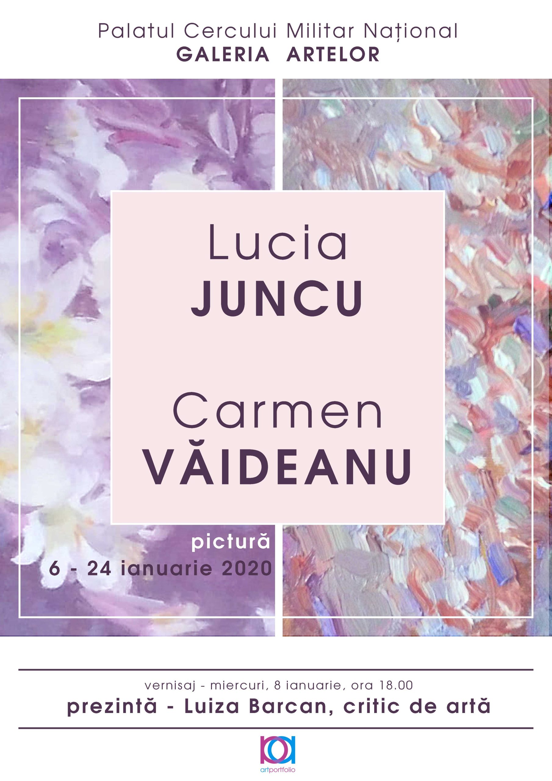 Expoziția de pictură a artiștilor plastici Carmen Văideanu și Lucia Juncu, deschisă în perioada 6 – 23 ianuarie 2020, zilnic, între orele 11.00 – 19.00. Expoziția a fost vernisată miercuri, 8 ianuarie, de către criticul de artă Luiza Barcan.