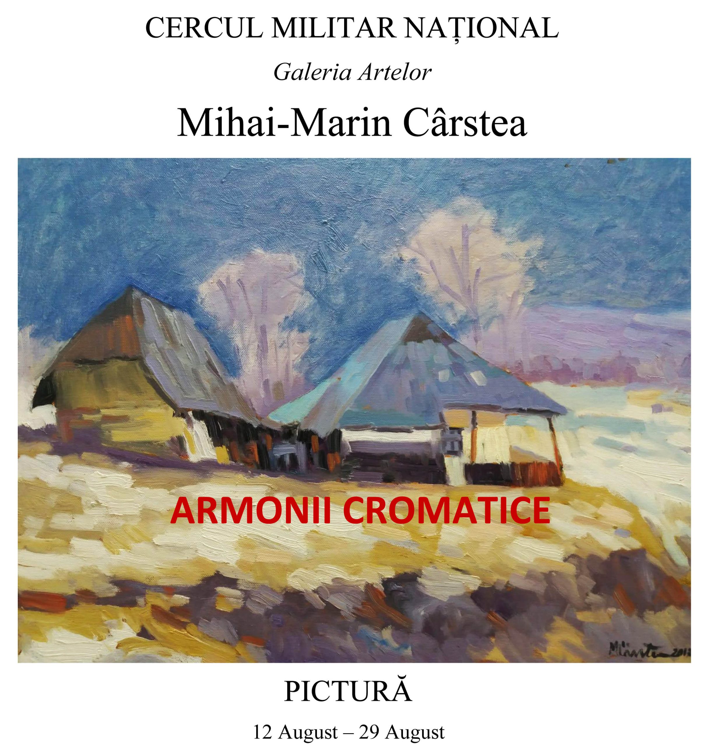 Între 12 și 29 august 2019, Galeria Artelor din cadrul Cercului Militar Național a găzduit expoziția pictorului Mihai-Marin Cârstea, intitulată Armonii cromatice. Este vorba despre o situare estetică temperată care evidențiază vocația contemplativă proprie autorului, dorința acestuia de a rezona cu valorile perene. Multiplicitatea peisajelor certifică apropierea profundă de natură, ale cărei detalii vor fi întotdeauna autentice. Anumite tablouri aderă programatic la un dezirabil ton al simplității, mereu capabilă să scoată la iveală noi și noi bucurii ale sufletului. Pictorul Mihai-Marin Cârstea se axează în special pe reliefarea elementelor tradiționale. Instantaneele din natură au o remarcabilă capacitate expresivă. Numeroasele portrete și naturi statice surprtind cu acuitate stări ce au patina inefabilului. Celebrând într-un fel paradigma ruralității, expoziția lui Mihai-Marin Cârstea nu poate decât să fie binevenită, pe fondul atît de eclecticului peisaj estetic contemporan.