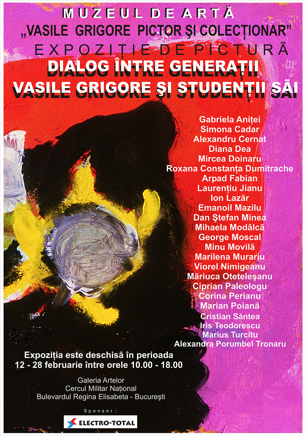 Expoziţia colectivă de pictură Dialog între generaţii – Vasile Grigore şi studenţii săi, organizată de Muzeul de Artă „Vasile Grigore – pictor şi colecţionar”, deschisă în perioada 11 – 28 februarie 2013. Expoziţia reuneşte opere ale maestrului Vasile Grigore din colecţia muzeului şi colecţii particulare cu lucrările unor foşti studenţi ai săi, ei înşişi personalităţi constituite, în ideea unui fertil „dialog” între maestru şi discipoli-un binevenit prilej pentru omagierea binecunoscutului pictor şi colecţionar. Alături de pictorul Vasile Grigore (1935-2012) expun următorii artişti: Gabriela Aniţei, Simona Cadar, Alexandru Cernat, Diana Dea, Mircea Doinaru, Roxana Constanţa Dumitrache, Arpad Fabian, Laurenţiu Jianu, Ion Lazăr, Emanoil Mazilu, Dan Ştefan Minea, Mihaela Modâlcă, George Moscal, Minu Movilă, Marilena Murariu, Viorel Nimigeanu, Măriuca Oteteleşanu, Ciprian Paleologu, Corina Perianu, Marian Poiană, Ciprian Sântea, Iris Teodorescu, Alexandra Porumbel Tronaru, Marius Turcitu.