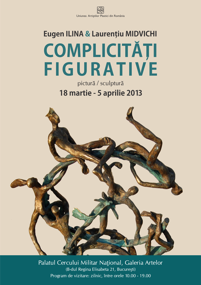 Expoziţia de pictură şi şi sculptură „Complicităţi figurative” a artiştilor plastici Eugen ILINA şi Laurenţiu MIDVICHI, deschisă în perioada 18 martie – 5 aprilie 2013. Discursul artistic, în măsura în care mediul vizual este şi unul discursiv, propune, în această expoziţie, cîteva întrebări cu privire la relaţia artei cu imaginarul politic, antropologic şi literar. Duplicitatea expresiei survine din complicitatea dintre interogaţie şi imersiune: imaginile deschid posibilitate imersiunii în spaţiile picturale şi discută posibilitatea interogativă a gestului artistic. Figura devine referinţă şi întrebare. „Apariţia dublului aduce cu sine contrastul: imaginaţia vizuală nu se poate înţelege fără chestionarea acestuia, de numeroase tipuri. Fie că ţine de culoare, textură sau tuşă, m-a preocupat mai ales contrastul ca joc de-a reconstrucţia figurii, ca formulă autoreferenţială şi, în acelaşi timp, simbolică”, a mărturisit Eugen Ilina.