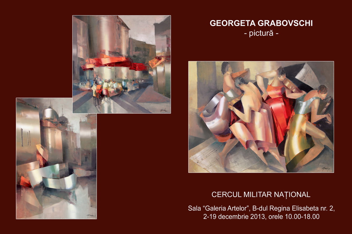 În perioada 2-19 decembrie 2013, prestigioasa Galerie a Artelor din cadrul Cercului Militar Naţional ne-a propus expoziţia de pictură a foarte cunoscutei artiste plastice Georgeta Grabovschi. Reprezentările estetice ale acesteia se adresează unui special tip de simţire, ce poate internaliza într-o firească tonalitate atât etericul cât şi concretul, simbioză proprie marilor creaţii. Cromatica potenţează misterul, foarte intens prezent. Parcă e retrăit fiorul marilor plecări simboliste atunci când, în cheie lirică, contemplăm porturile, voiajele sau citadinele semnate de Georgeta Grabovschi. Oraşe-simbol ca Paris, Veneţia, Milano, Barcelona ş.a. sunt apodictice subiecte ale acestei importante transfigurări picturale. Atât de particularele abordări „în cuţit şi mistrie” marchează şi naturile statice, persuasive exemplificări profund spiritualizate. Un consistent tronson tematic al operelor despre care vorbim constă în numirea eclectismului artistic, anumiţi interpreţi, dansatori, teatraliştirevelând noi faţete caracteristice fascinaţiei lumii artei. Tablourile, lucrate la şevalet, au dimensiuni mari, element nou în raport cu cele precedente, de mai mici dimensiuni. Evidenţa fiorului abstractizant poate fi observabilă în interiorul foarte specialului realism profesat. Geometrizările poartă cu ele tuşe venusiene care îmblânzesc şi estetizează pregnant compoziţiile.