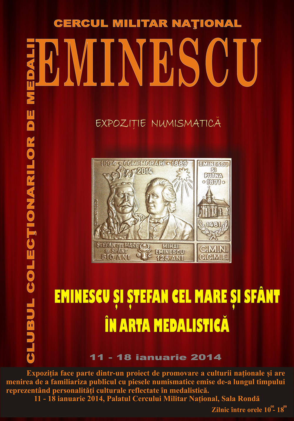 Clubul Colecţionarilor de Medalii Eminescu din cadrul Cercului Militar Naţional marchează sâmbătă, 11 ianuarie 2014, evenimentele consacrate Zilei Culturii Naţionale, prin vernisarea expoziţiei numismatice „Eminescu şi Ştefan cel Mare şi Sfânt în arta medalistică”. Expoziţia este deschisă în perioada 11 – 18 ianuarie 2014.